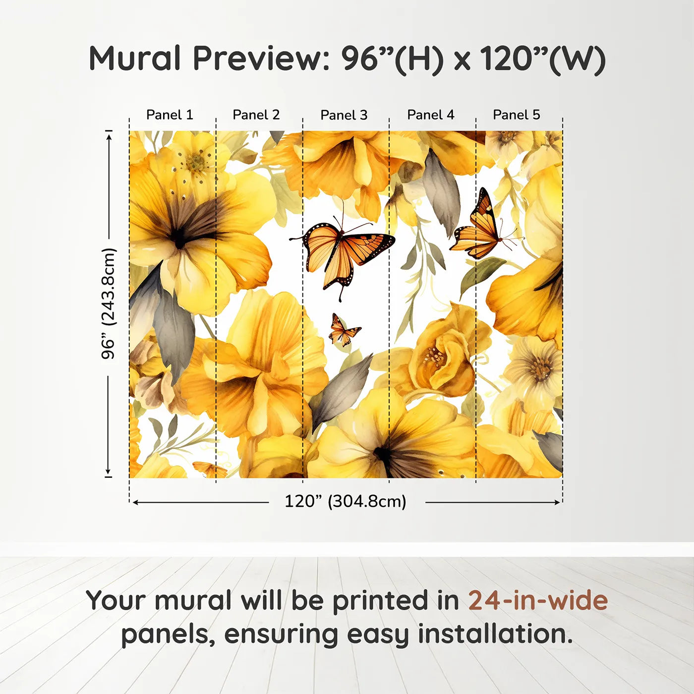 This stunning and beautiful wall mural features a lush garden of yellow flowers with golden-hued butterflies fluttering among them. The warm, painterly watercolor style creates a joyful and enchanting atmosphere, perfect for a sunny nursery or a little girl's bedroom with a love for nature's beauty.