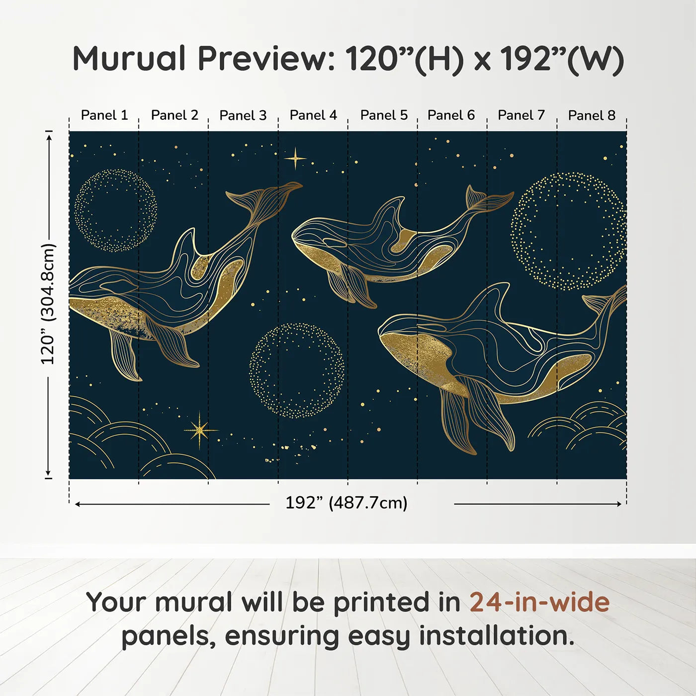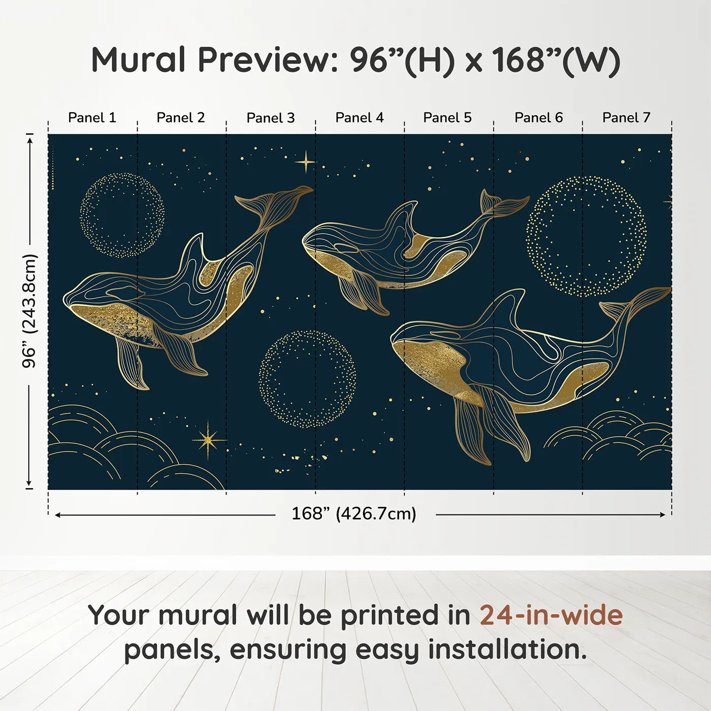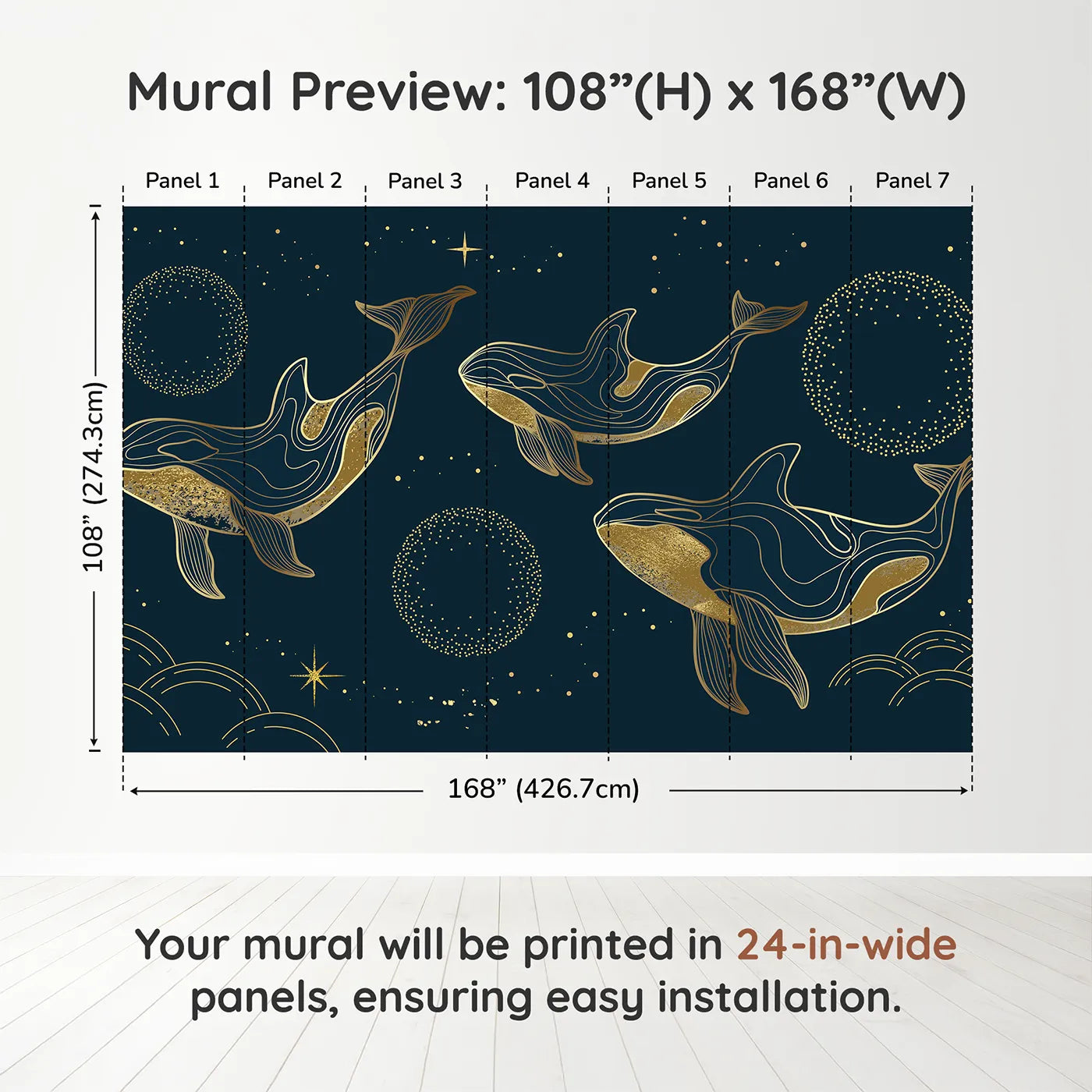 Golden Cosmic Whales Wall Mural - An Elegant Swim Through a Golden Galaxy