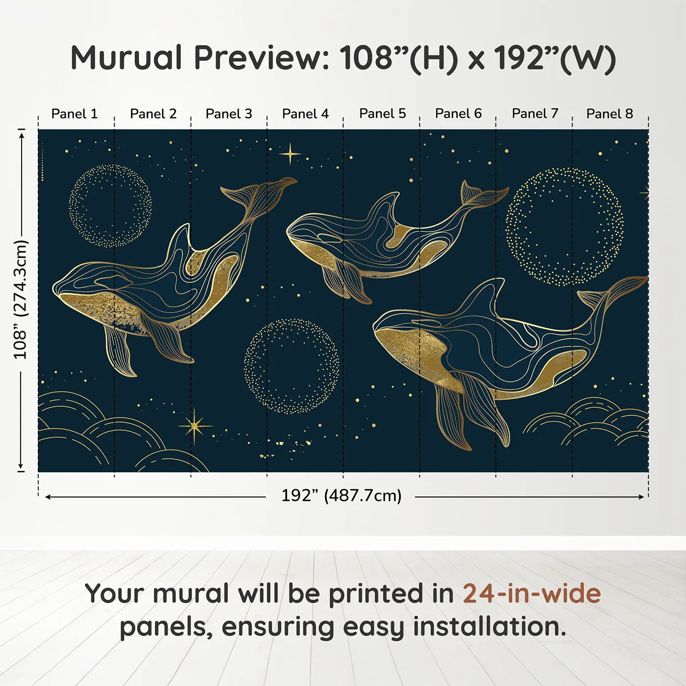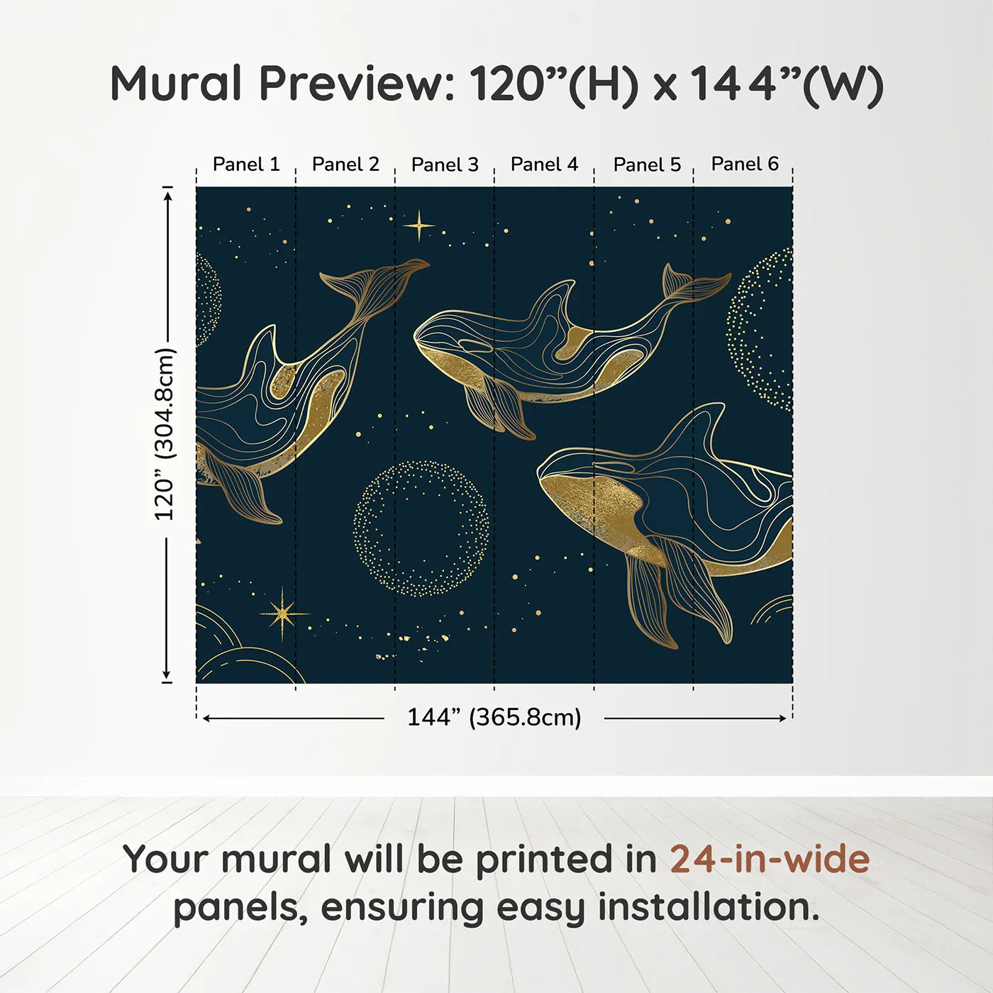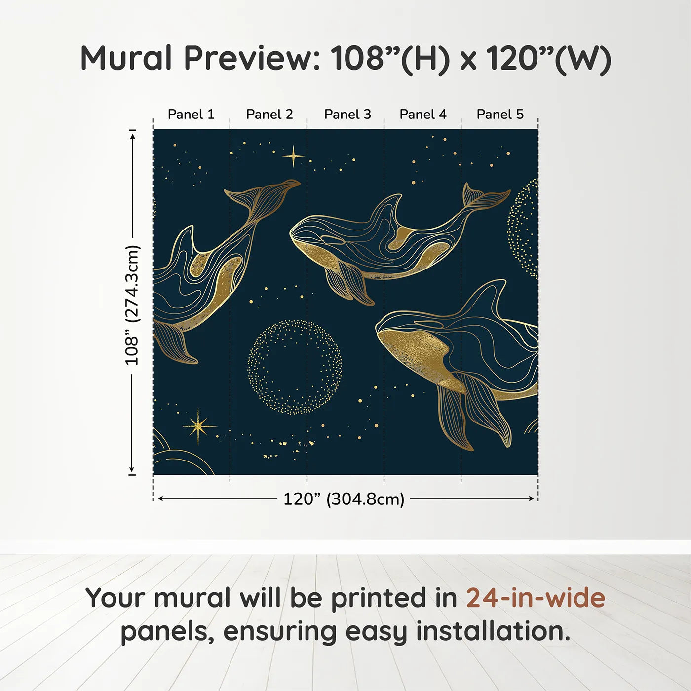Golden Cosmic Whales Wall Mural - An Elegant Swim Through a Golden Galaxy