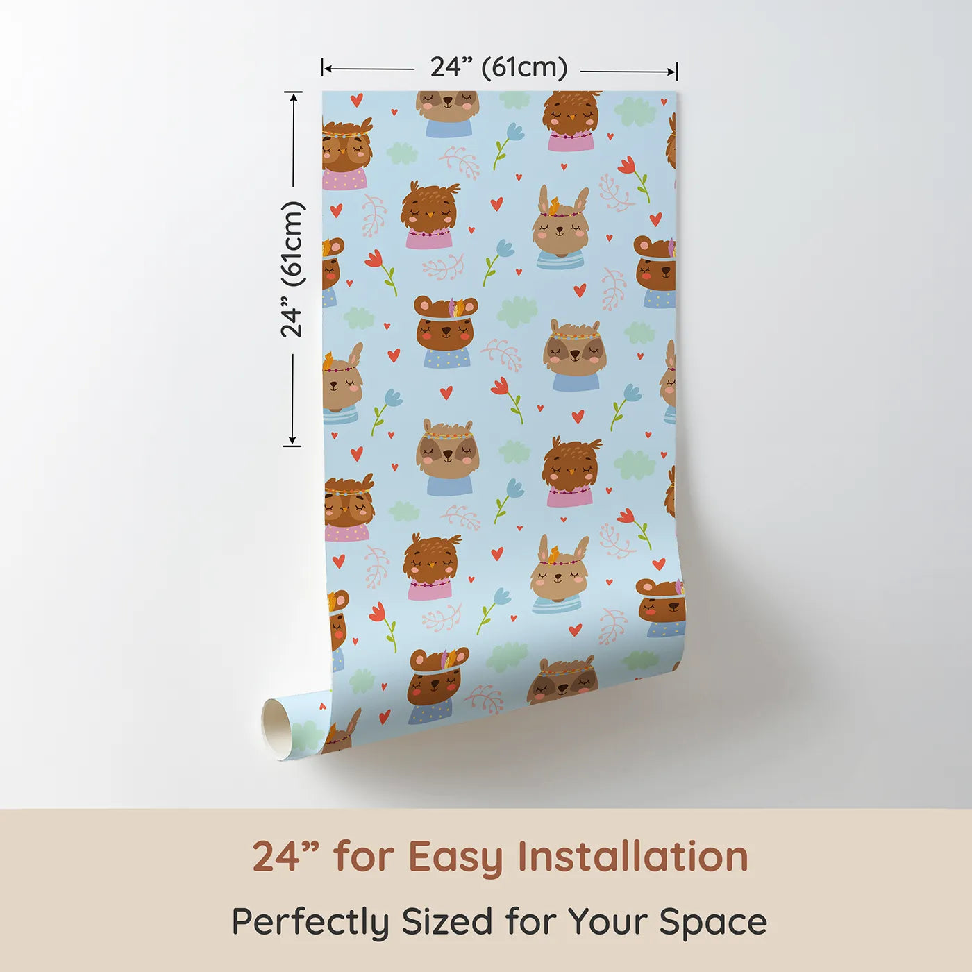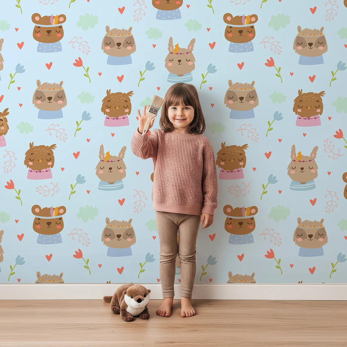 Create a cozy and playful backdrop with our charming kids wallpaper. This design features sleepy woodland animals-bears, owls, bunnies, and raccoons-all wearing sweet floral headbands on a serene sky blue background. Surrounded by hearts and flowers, it sets a scene of gentle wonder.