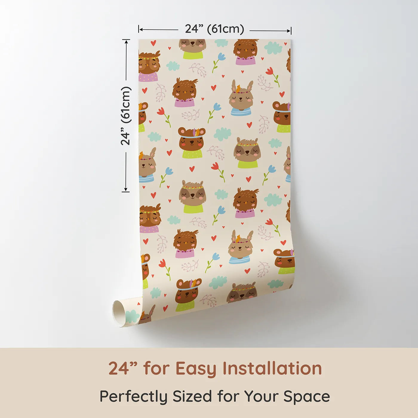 Create a cozy and playful backdrop with our charming kids wallpaper. This design features sleepy woodland animals-bears, owls, bunnies, and raccoons-all wearing sweet floral headbands on a warm cream background. Surrounded by hearts and flowers, it sets a scene of gentle wonder.
