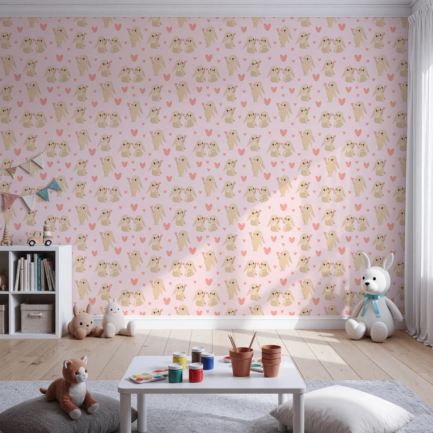 This charming animal wallpaper features a pattern of sweet bunnies holding bright pink hearts. Set against a soft blush pink background, this simple and adorable design brings a feeling of love and gentleness to any nursery or toddler's room. It's a classic choice that will never go out of style.