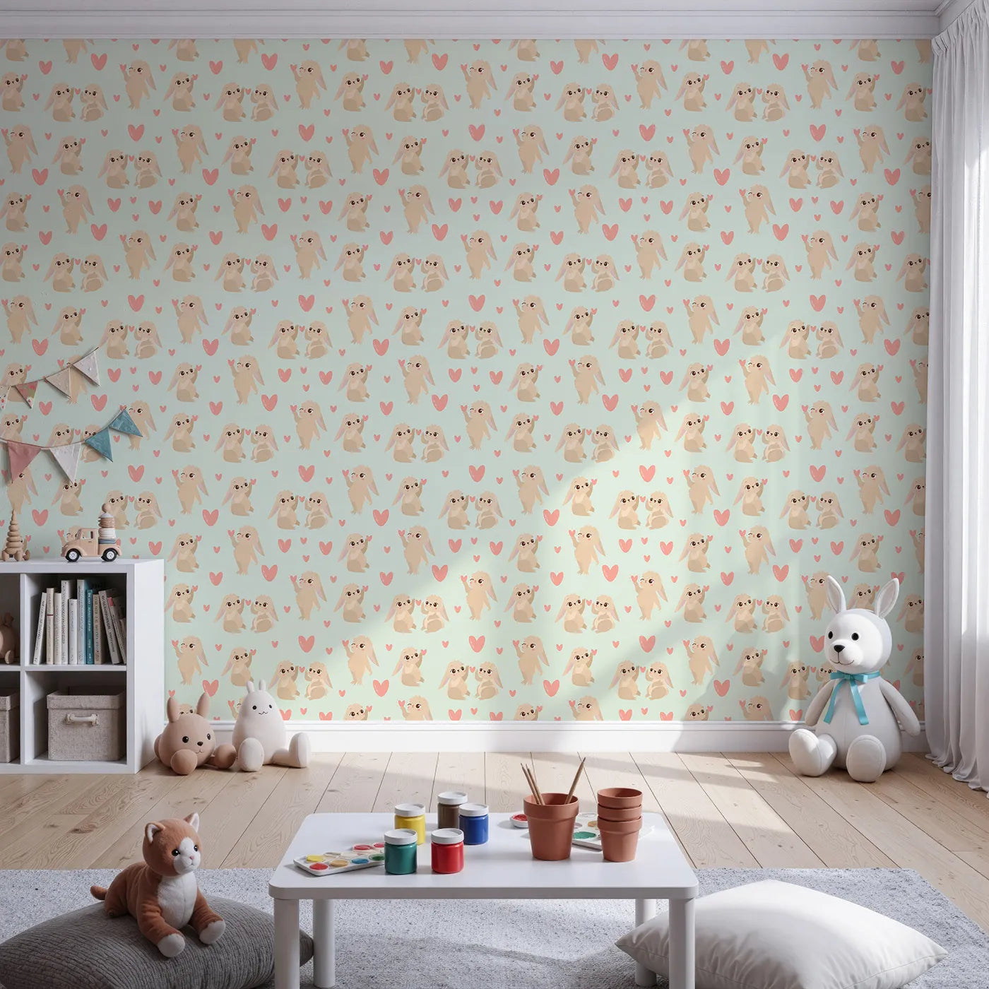 This charming animal wallpaper features a pattern of sweet bunnies holding bright pink hearts. Set against a fresh mint green background, this simple and adorable design brings a feeling of love and gentleness to any nursery or toddler's room. It's a classic choice that will never go out of style.