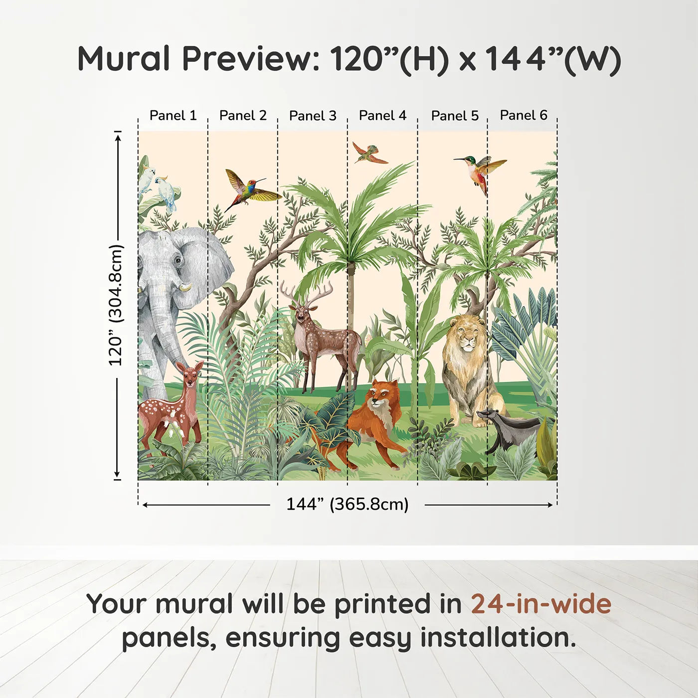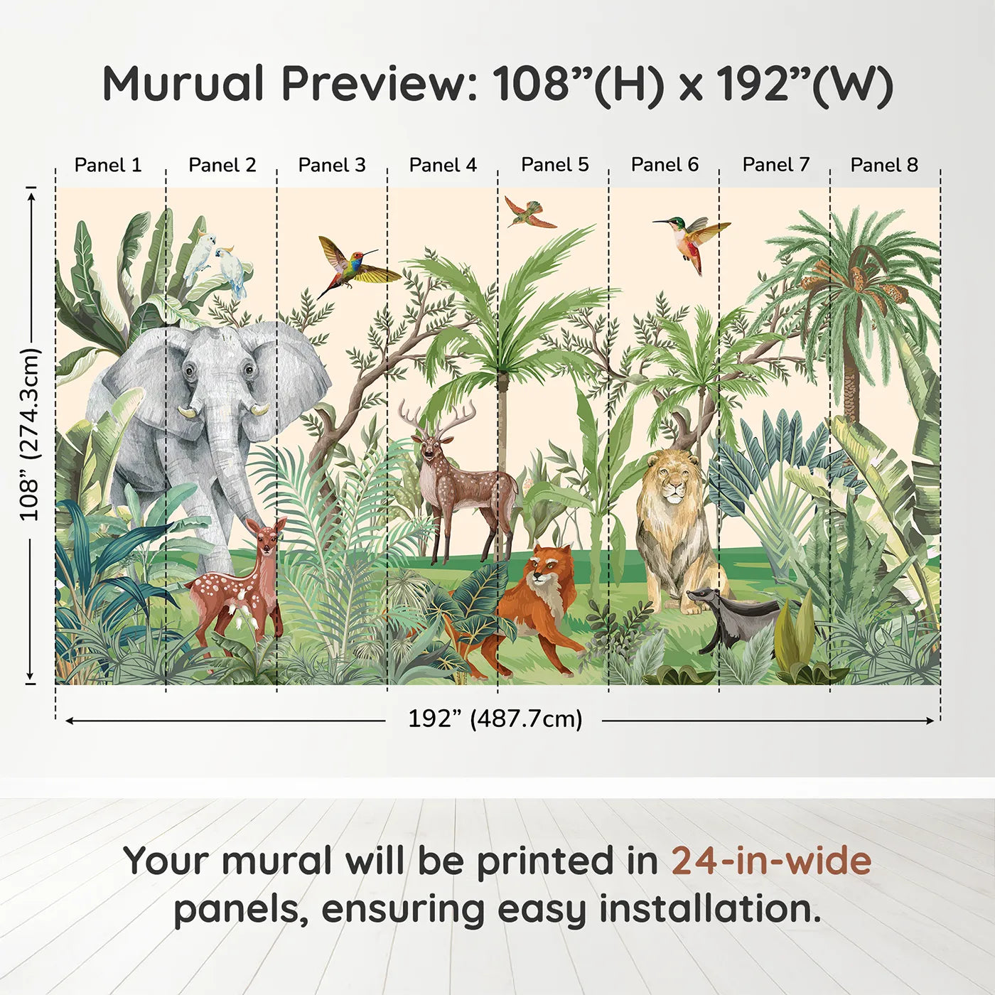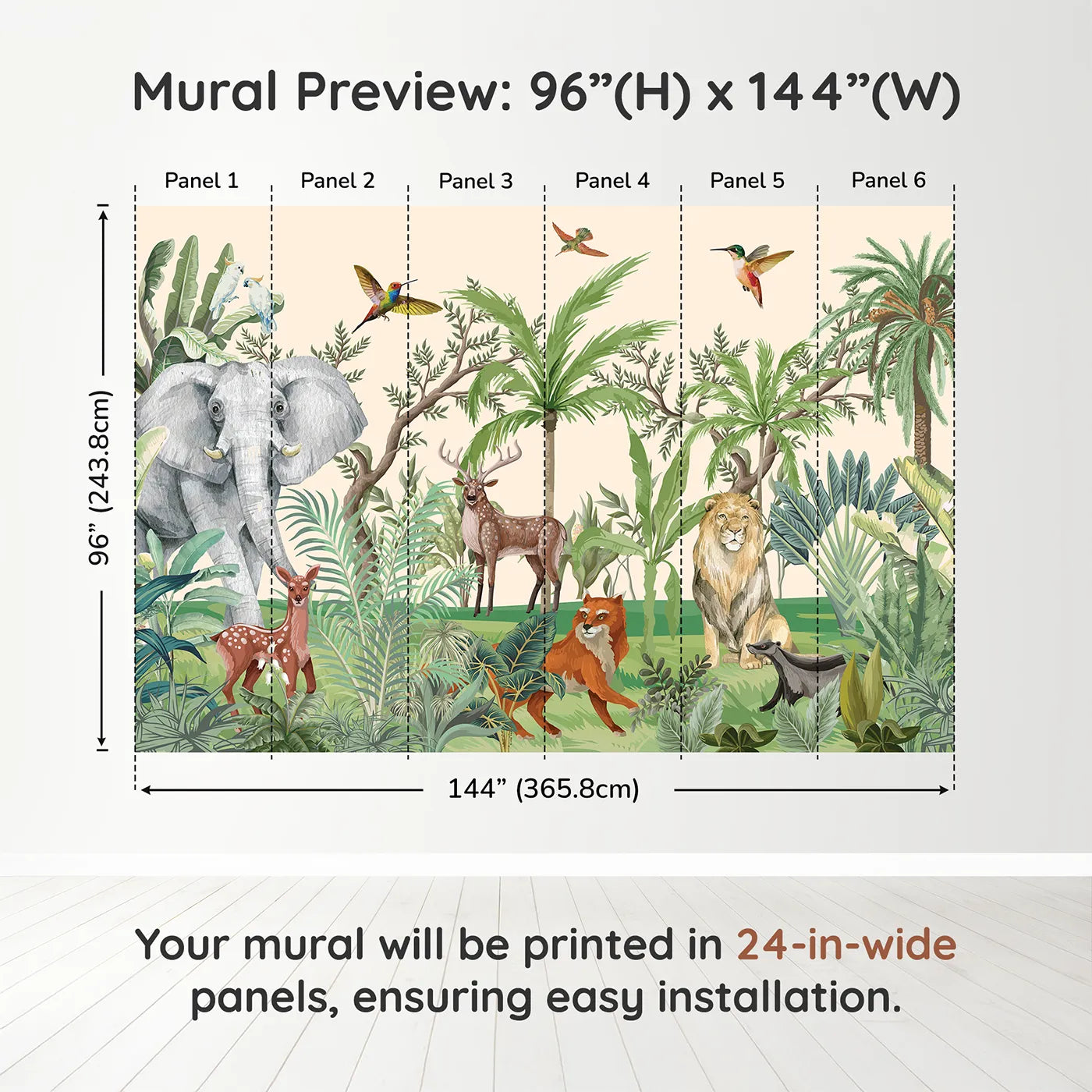 This charming jungle wall mural is bustling with friendly faces! A giraffe, zebra, cheetah, elephant, and other safari animals are gathered together in a lush jungle. The beautiful, realistic watercolor style brings each animal to life, perfect for a little wildlife lover.