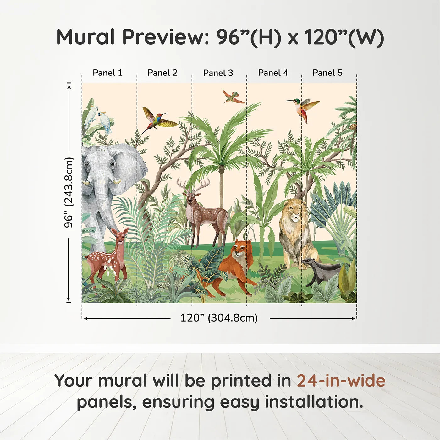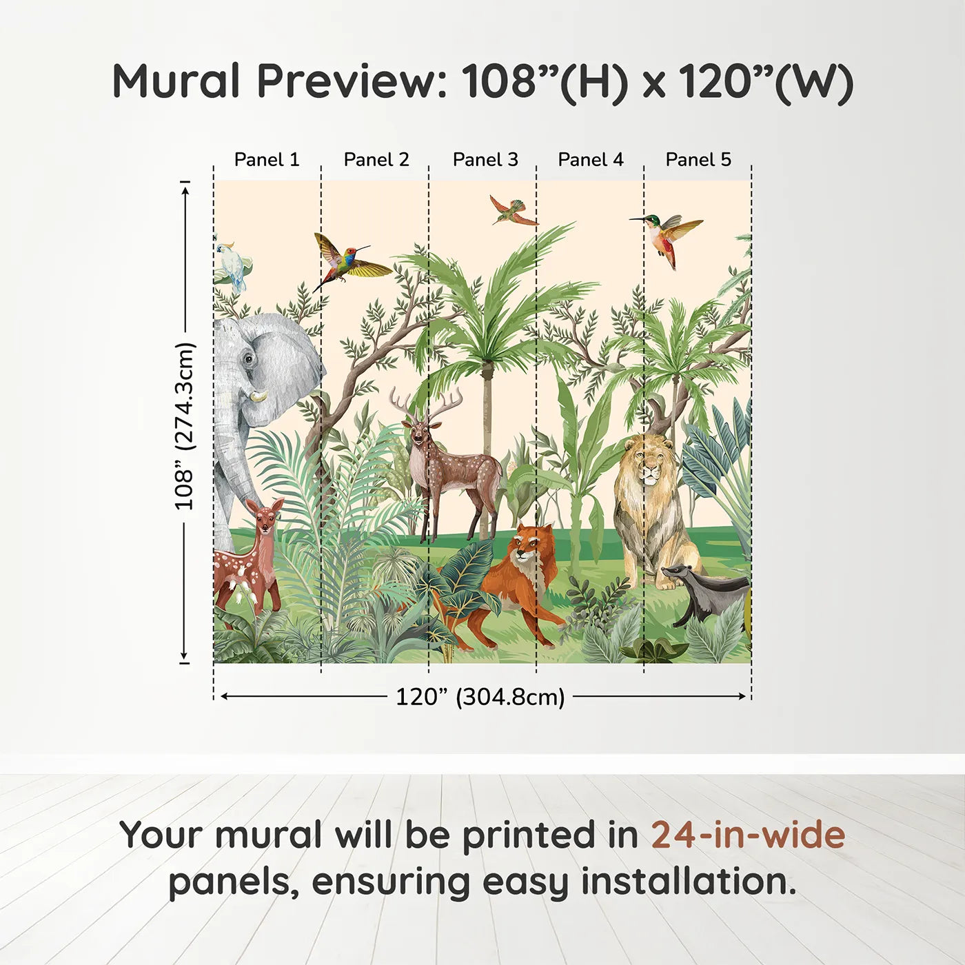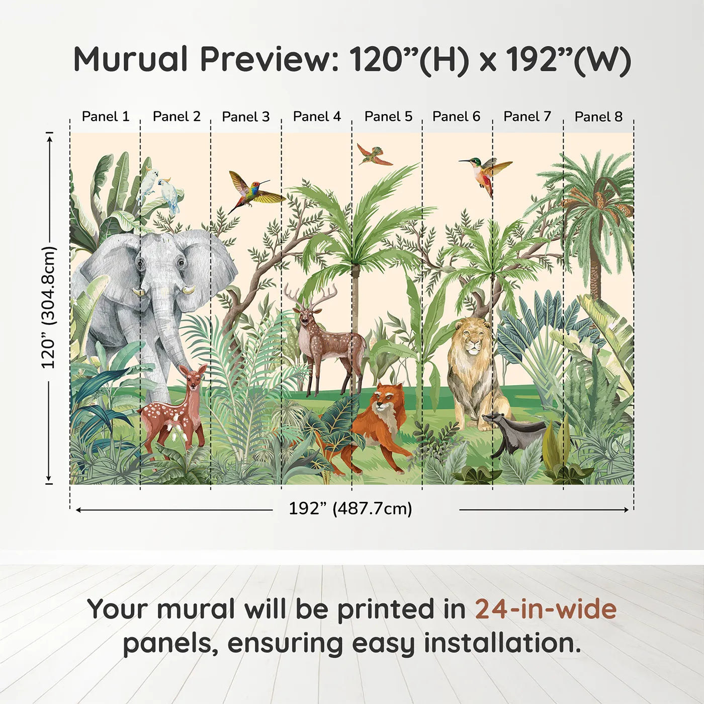This charming jungle wall mural is bustling with friendly faces! A giraffe, zebra, cheetah, elephant, and other safari animals are gathered together in a lush jungle. The beautiful, realistic watercolor style brings each animal to life, perfect for a little wildlife lover.
