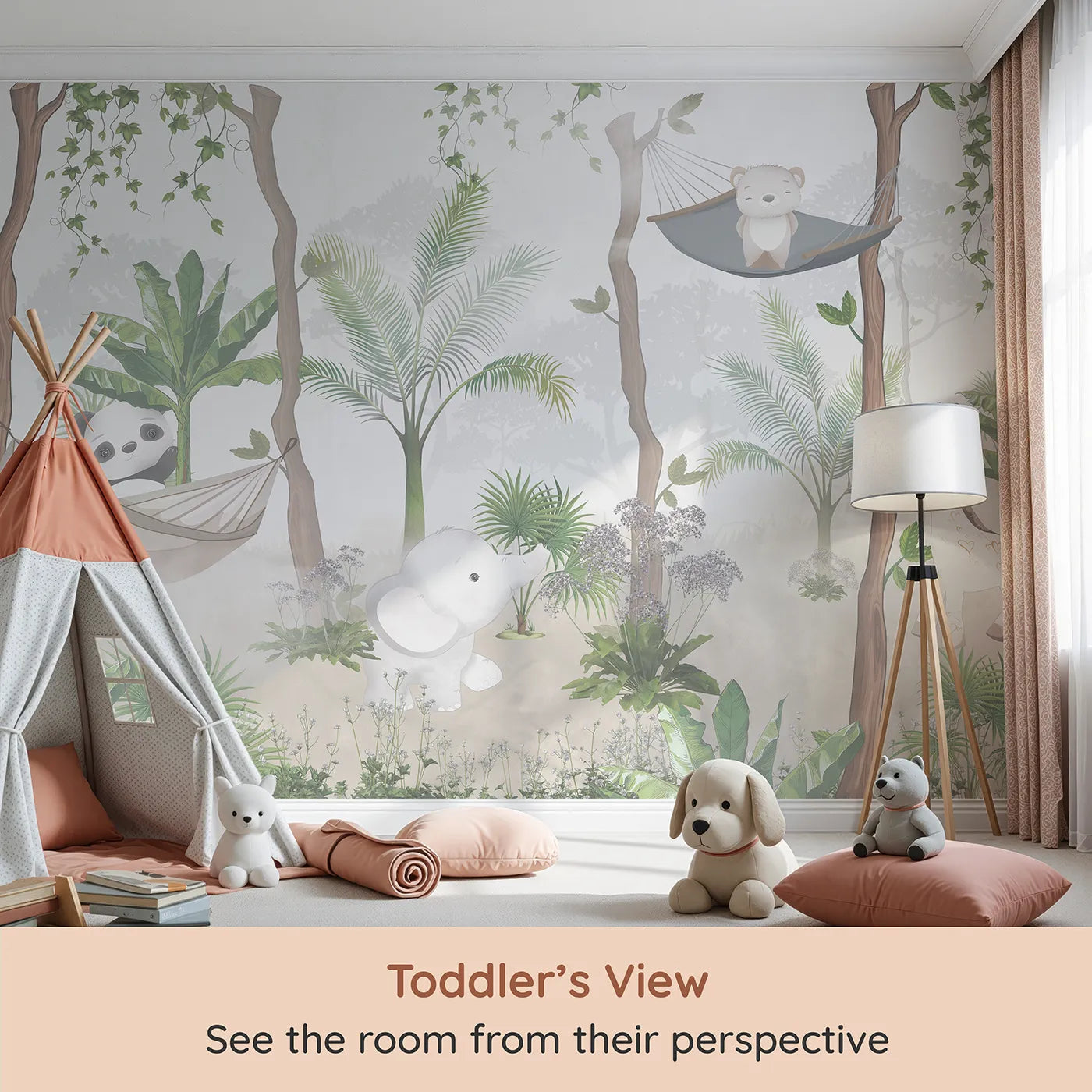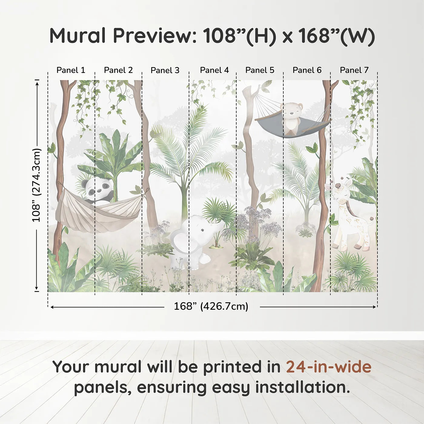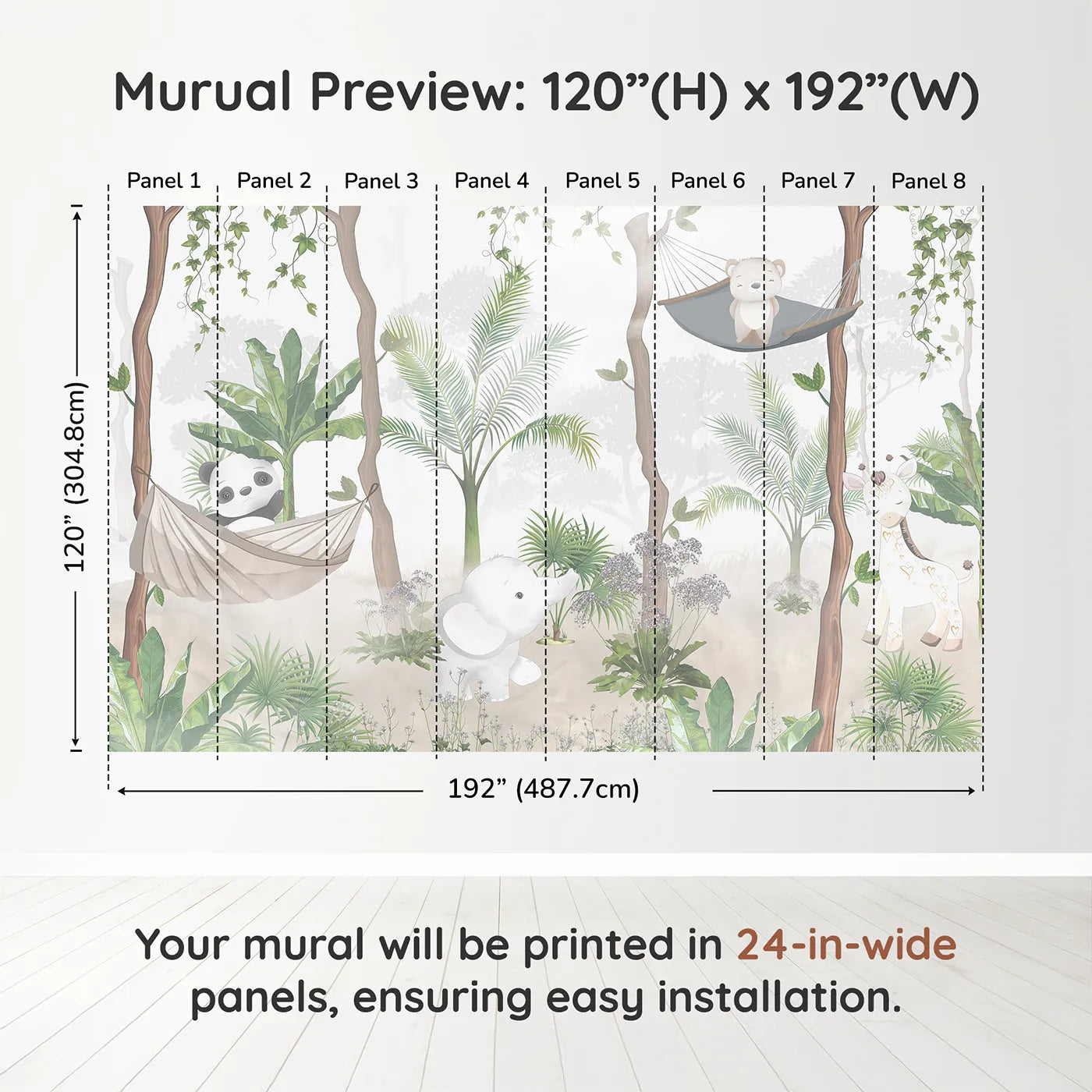 This sweet and playful wall mural features a group of cute jungle animals, including an elephant, panda, and giraffe, relaxing in hammocks and playing in the trees. The gentle colors and charming illustration style create a warm and loving atmosphere, perfect for a calm and happy nursery.