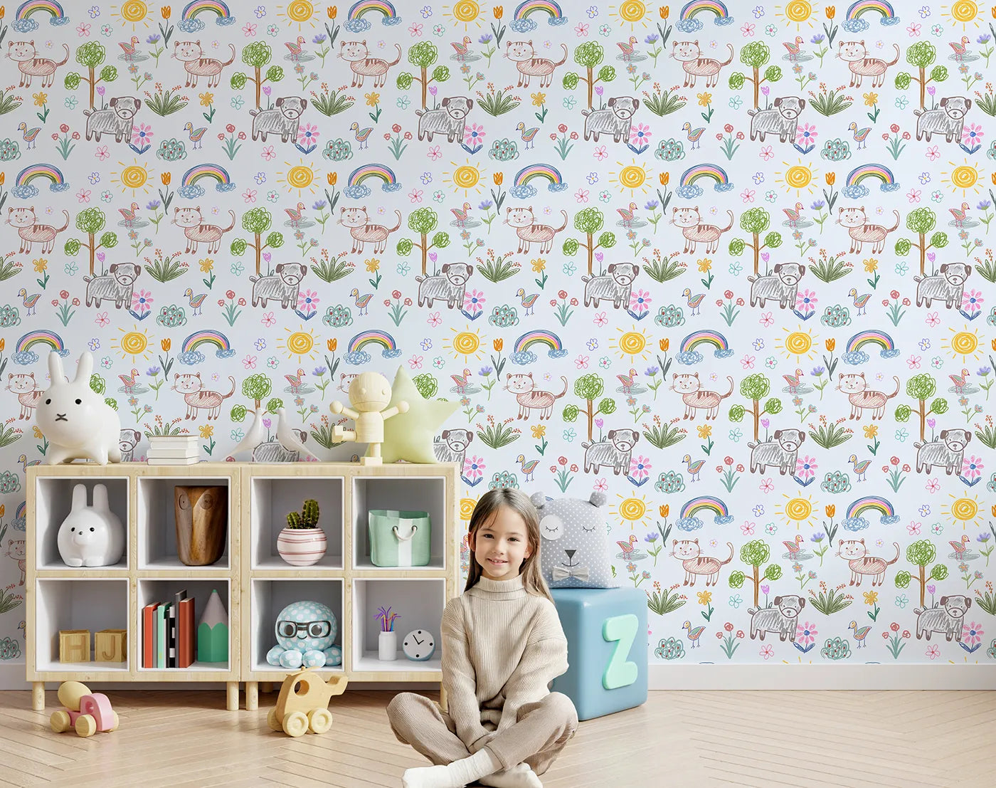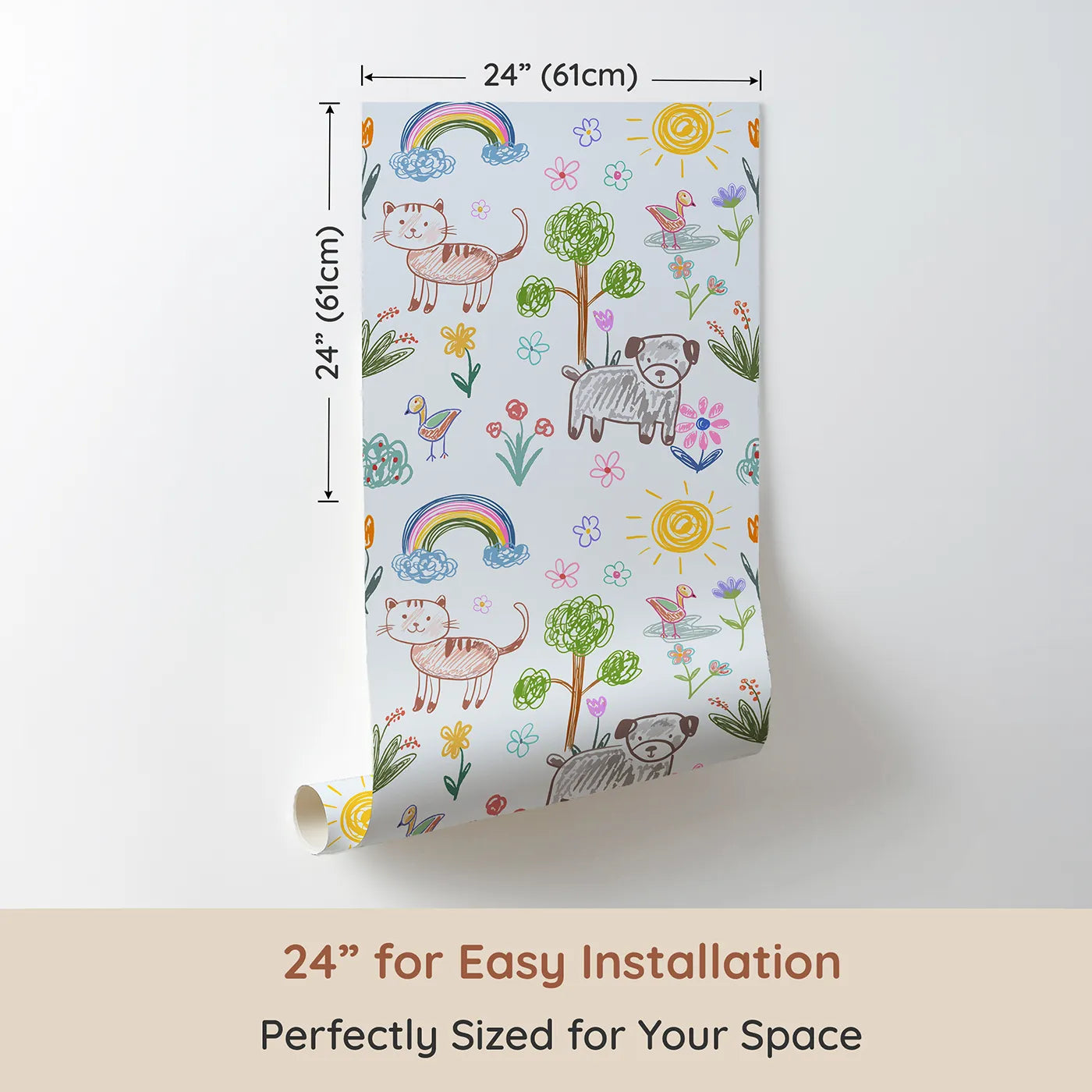 This fun and creative kids wallpaper is like a masterpiece drawn by your little one! A charming, crayon-style drawing of a cat, a dog, a rainbow, and flowers fills the page with color and joy. It's the perfect design for a playroom or creative corner, inspiring them to make their own art.