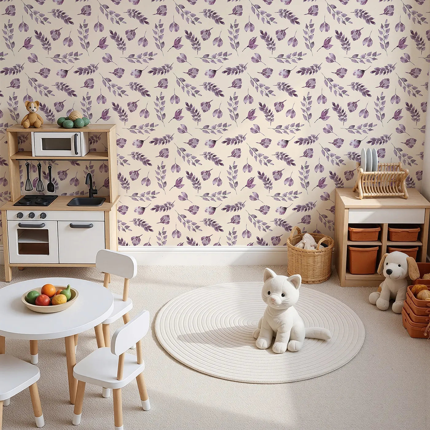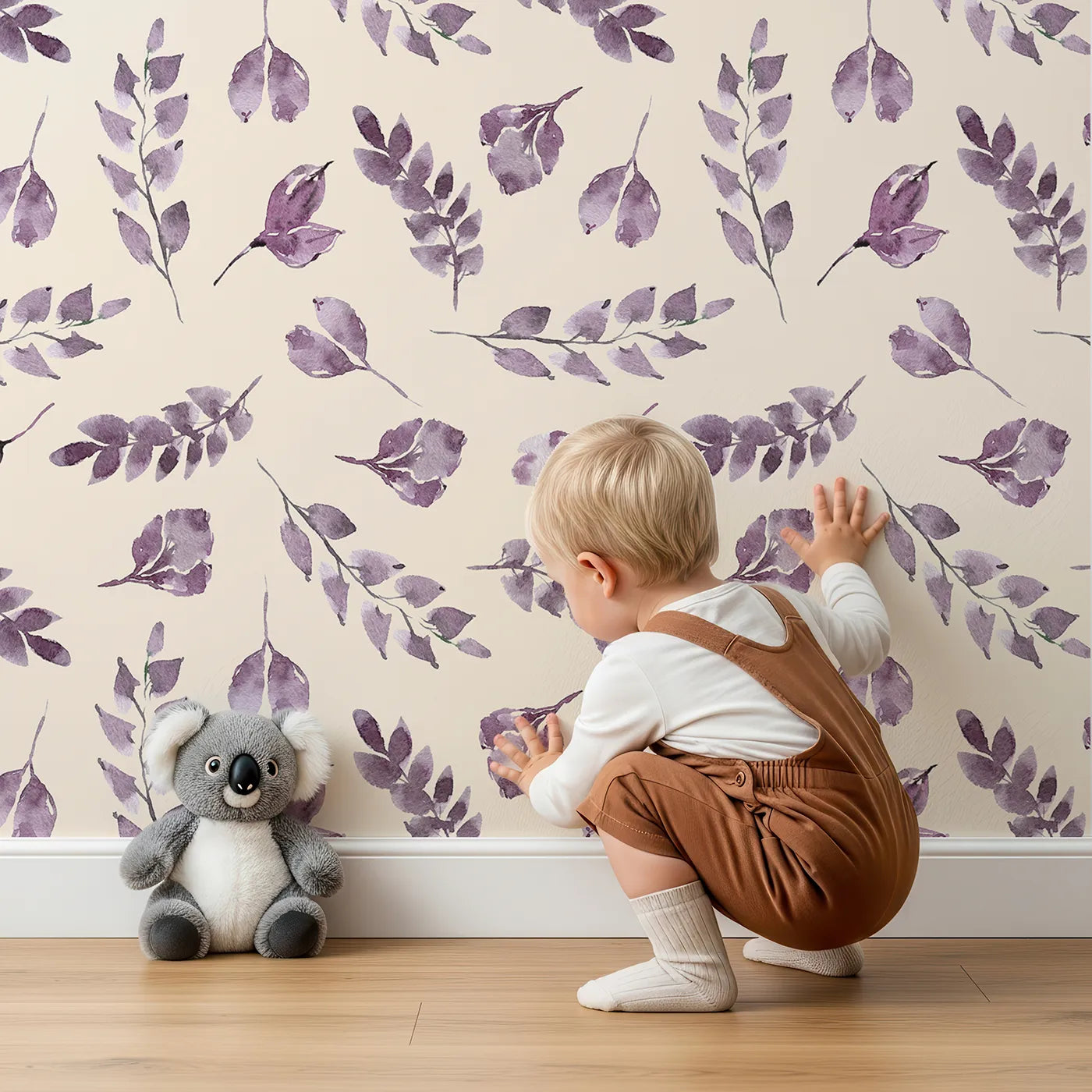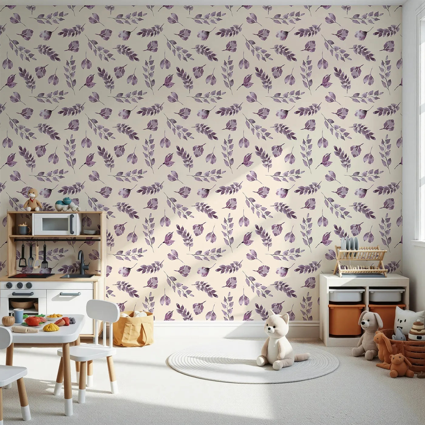 This beautiful botanical wallpaper brings a sense of calm to any room with its pattern of gracefully falling watercolor leaves on a warm sand background. The soft lavender and purple tones create a soothing and dreamy atmosphere, making it a perfect choice for a nursery or a peaceful reading corner.