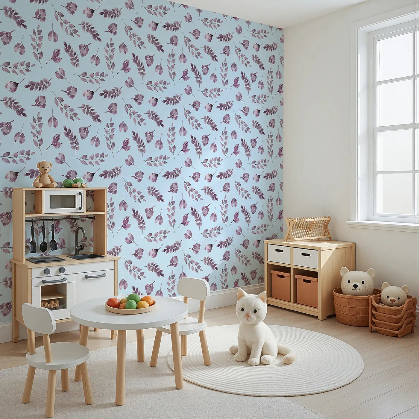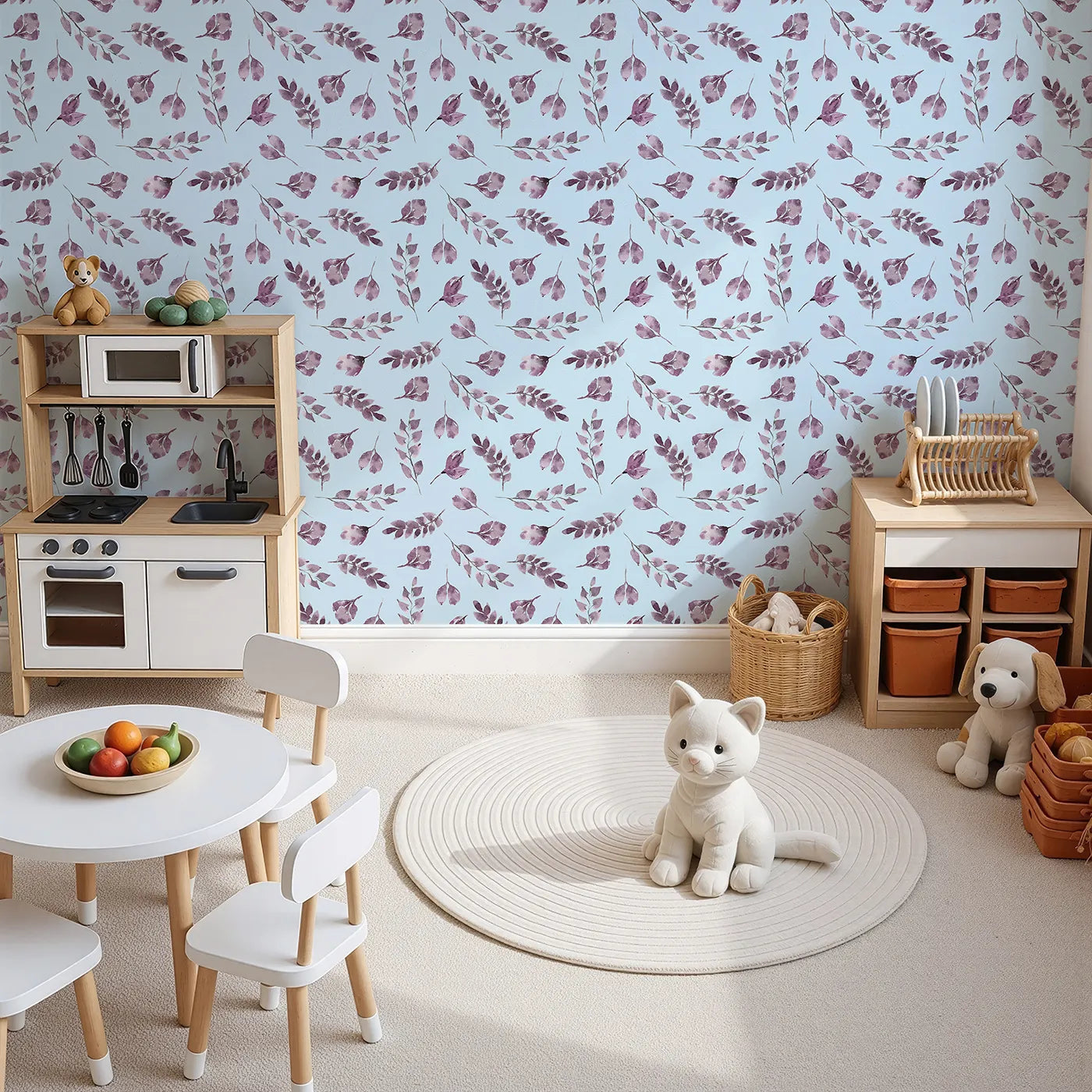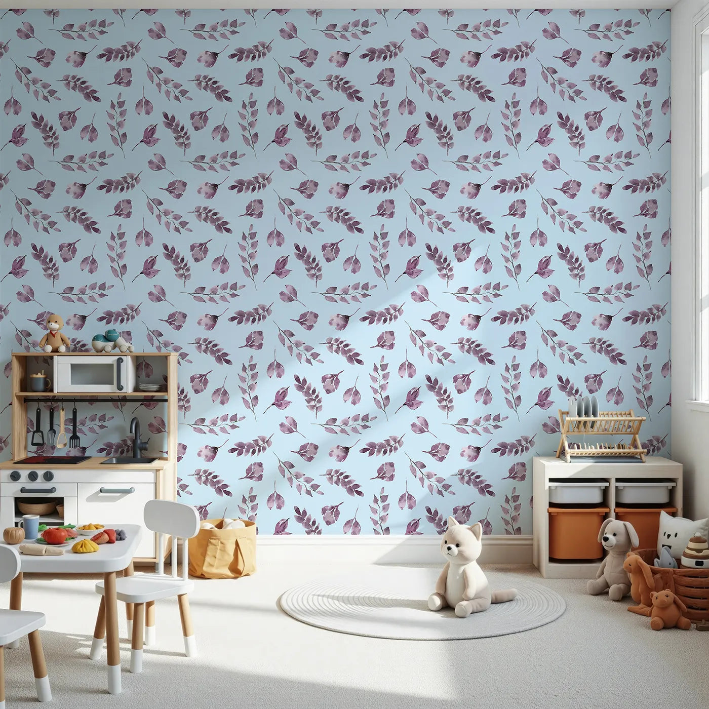 This beautiful botanical wallpaper brings a sense of calm to any room with its pattern of gracefully falling watercolor leaves on a sky blue background. The soft lavender and purple tones create a soothing and dreamy atmosphere, making it a perfect choice for a nursery or a peaceful reading corner.