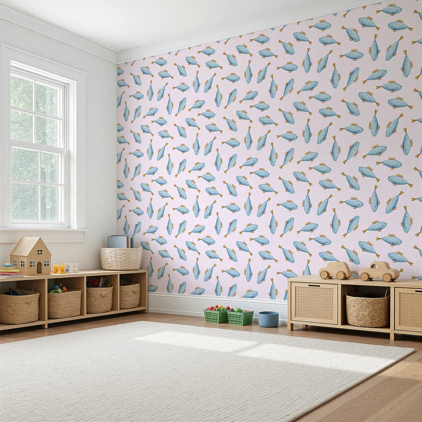 This sweet kids wallpaper features a playful pattern of little blue watercolor fish, set against a warm blush pink background. The minimalist design adds a modern, nautical touch to any nursery, creating a space that feels both cozy and chic for your little guppy.