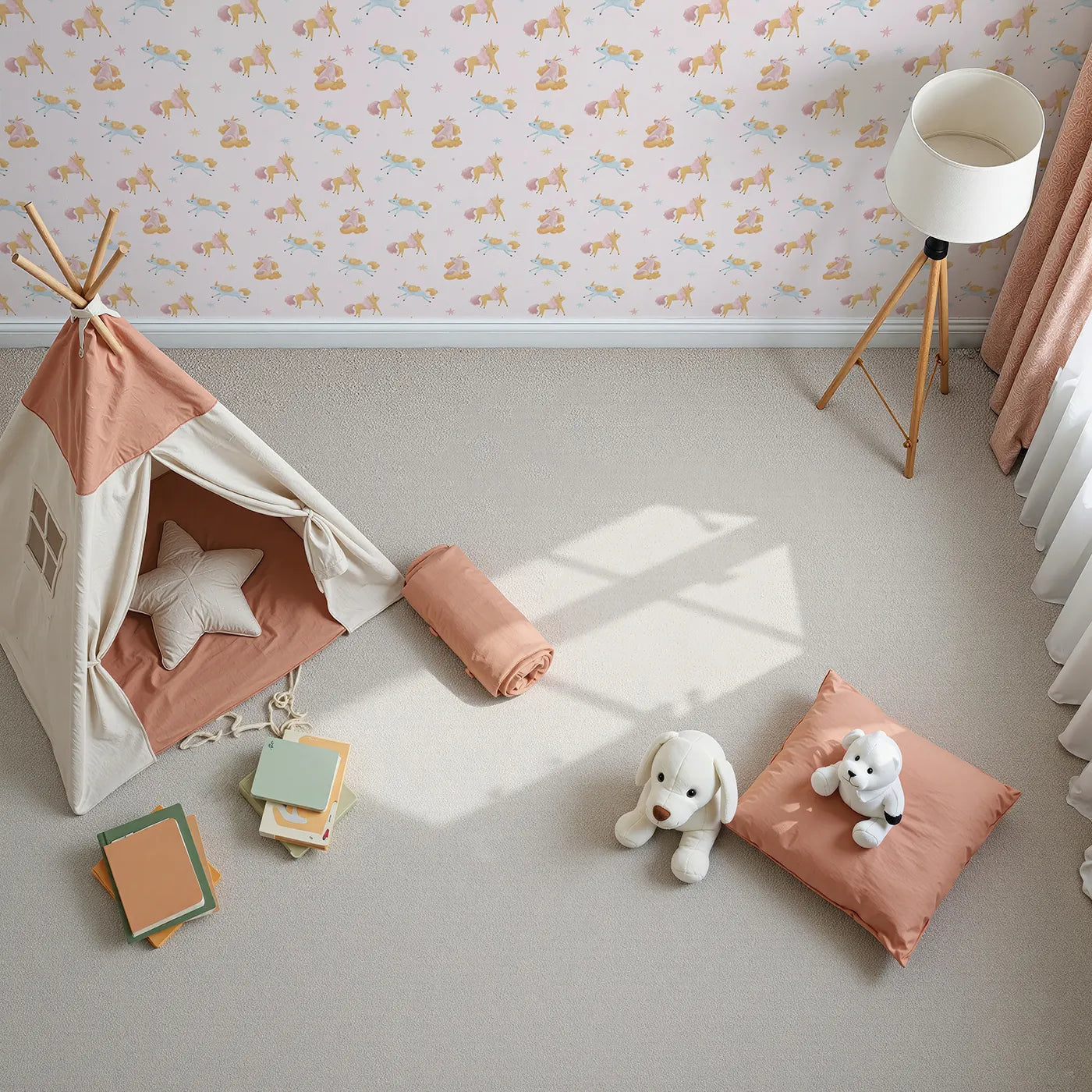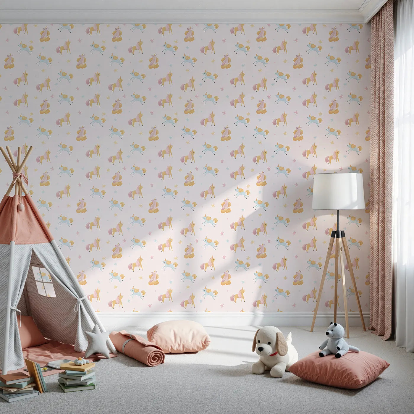 This enchanting wallpaper brings a world of fantasy to your child's room. A playful mix of unicorns and horses with beautiful manes gallop and fly across the design, creating a sense of movement and magic. It's a perfect backdrop for imaginative adventures and storytelling.