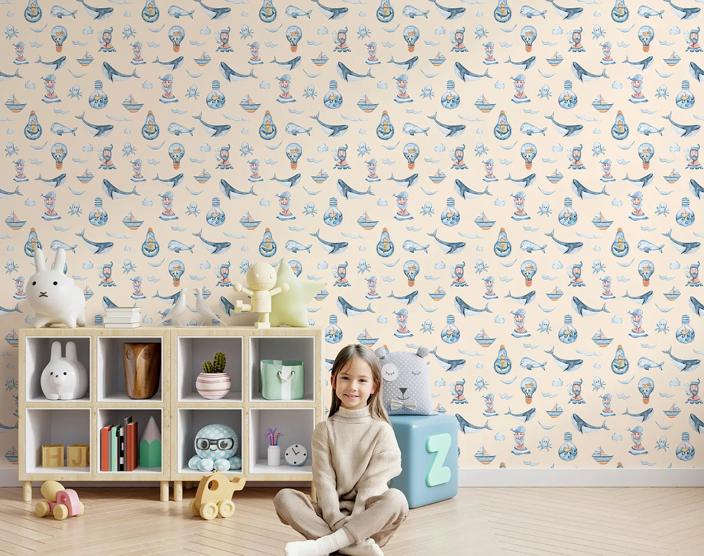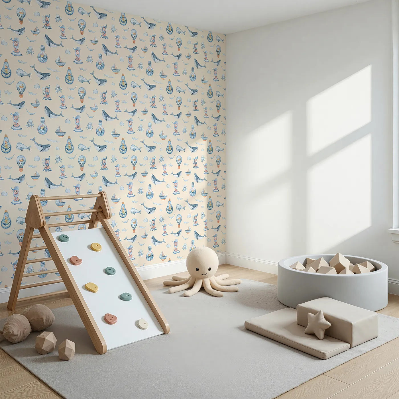 Create a cozy and playful backdrop with this charming seaside wallpaper. Whimsical watercolor boats, whales, fish, and lighthouses are scattered across a warm cream background. This gender-neutral wallpaper is perfect for sparking imaginative playtime and sweet dreams of the ocean.