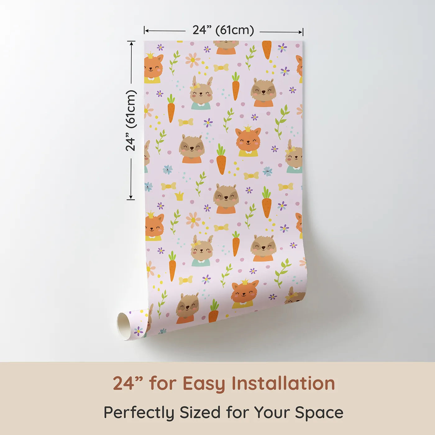 This charming wallpaper features sweet, hand-drawn portraits of woodland royalty-a fox, a bunny, and a raccoon-each adorned with a little flower crown or bow. Set against a soft blush pink background with carrots and flowers, this design is perfect for creating a gentle and imaginative space.