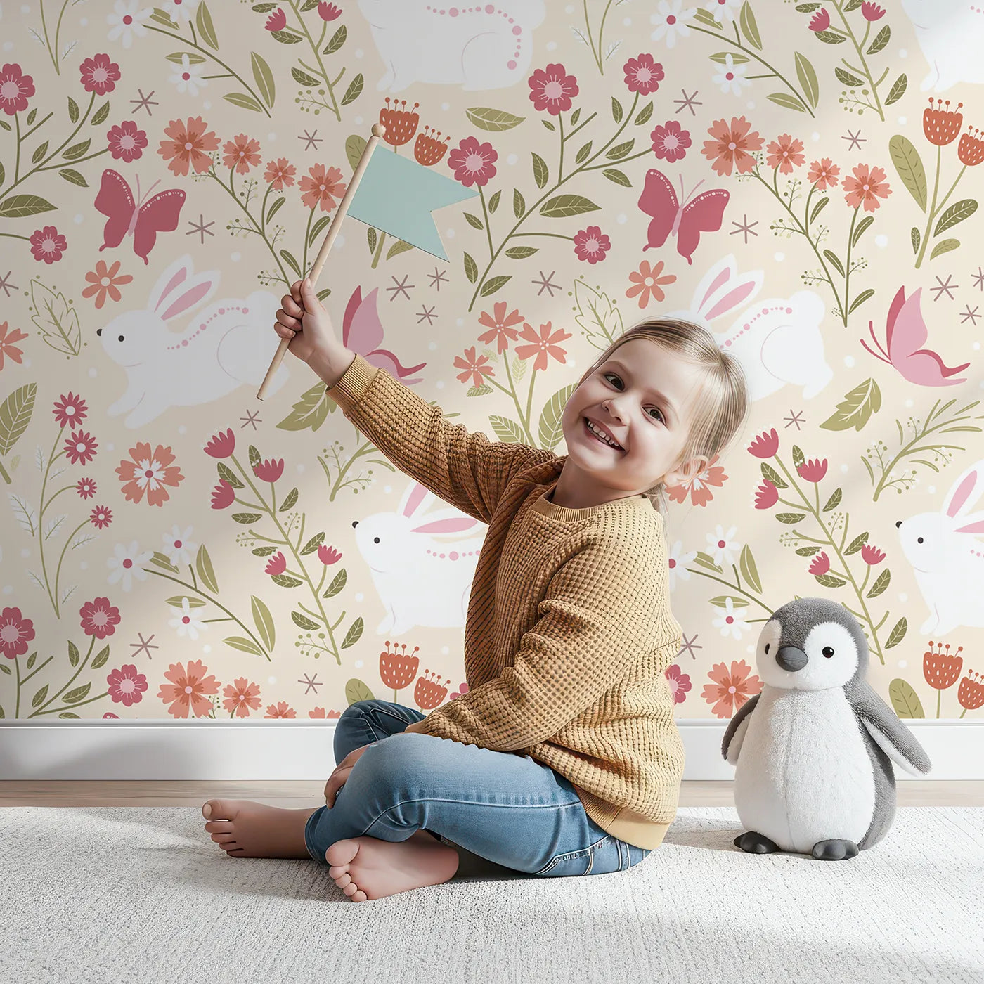 This charming nursery wallpaper features a pattern of cute white bunnies and butterflies in a meadow of colorful wildflowers, all on a warm, sandy beige background. The neutral color palette gives this playful design a sophisticated touch, making it perfect for a modern, calming nursery.