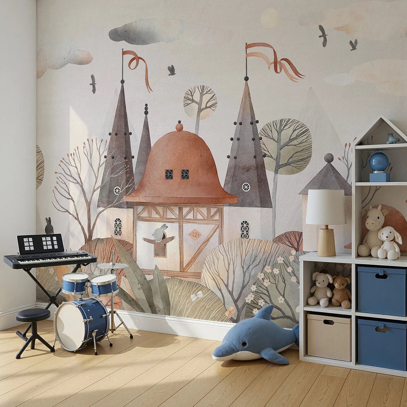 Let their imagination wander through the streets of this magical rabbit town. This detailed watercolor wall mural features a charming medieval village complete with castles, quaint houses, and adorable rabbit villagers. It's a scene brimming with warmth, character, and stories waiting to be told.