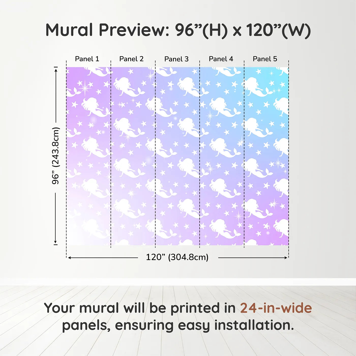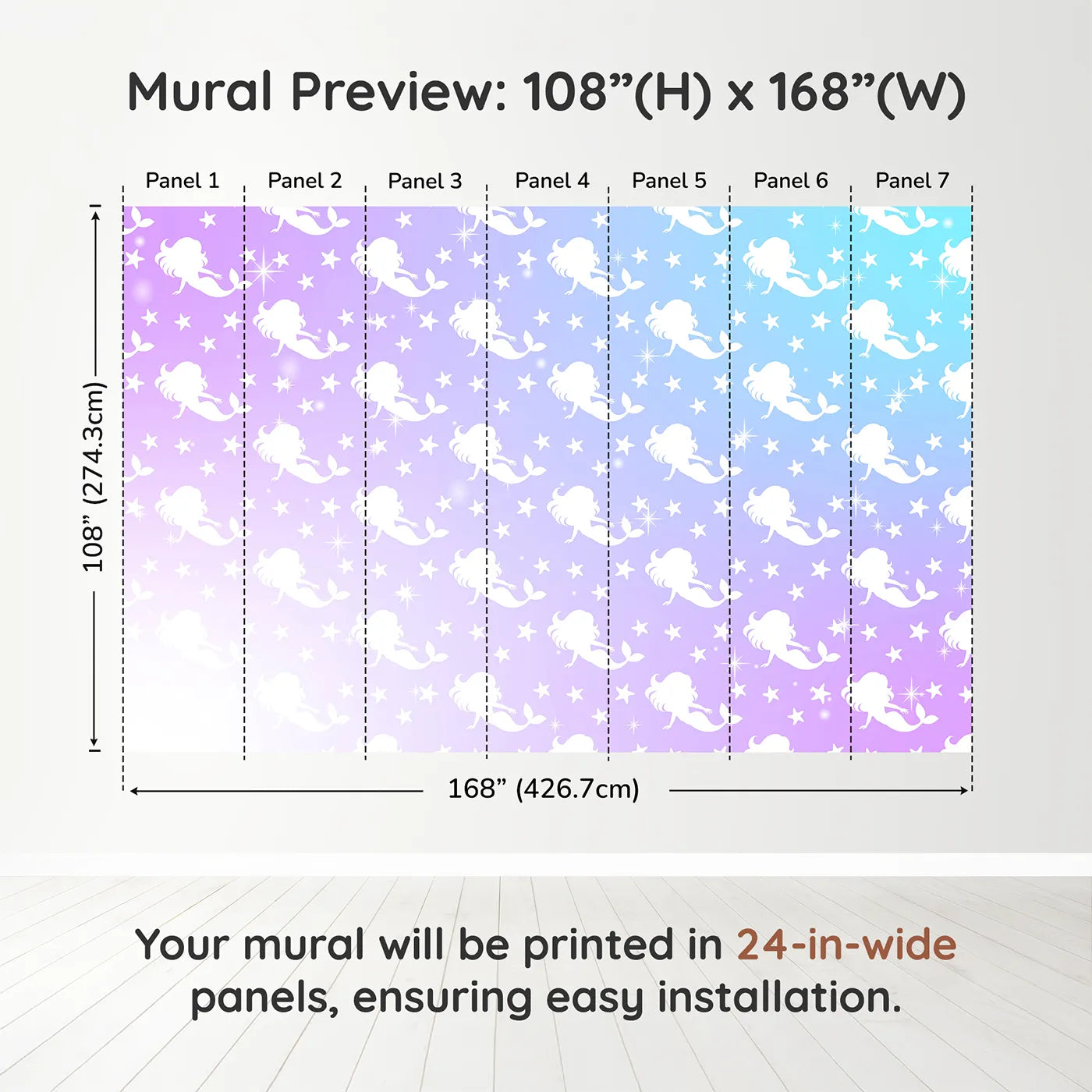 This charming girls wallpaper is full of underwater magic. A repeating pattern of white mermaid silhouettes swims through a sparkling, pastel rainbow sea of purple, pink, and blue. It's a dreamy and enchanting design perfect for a little mermaid's bedroom.