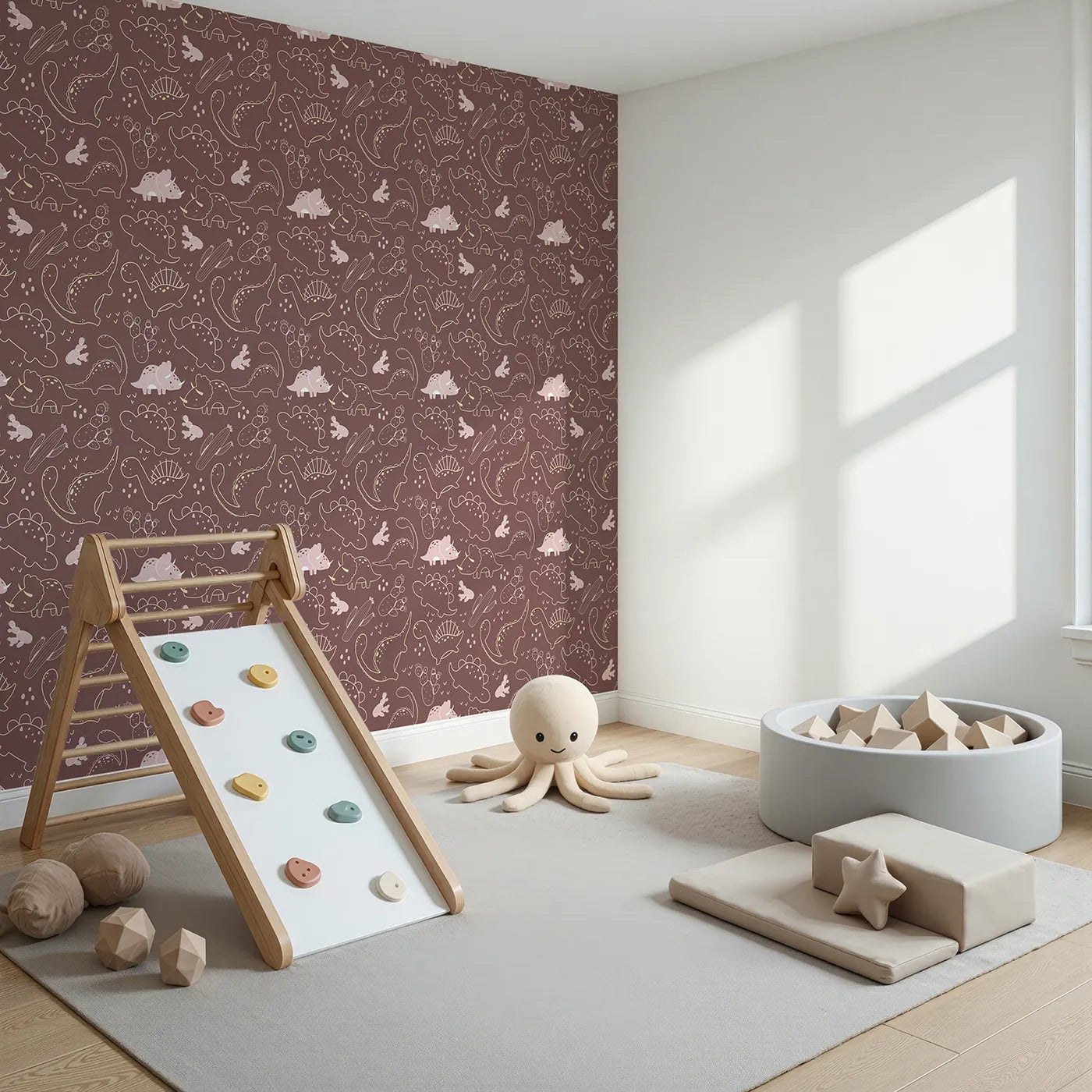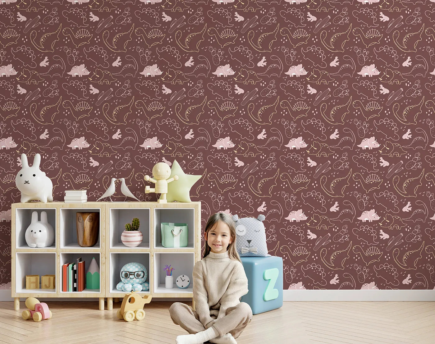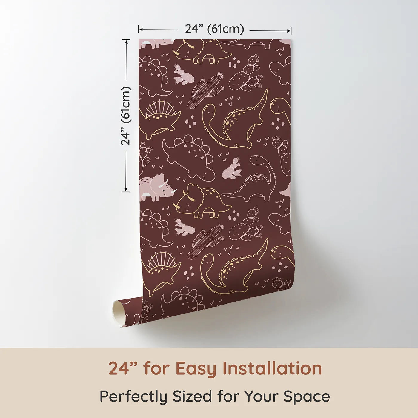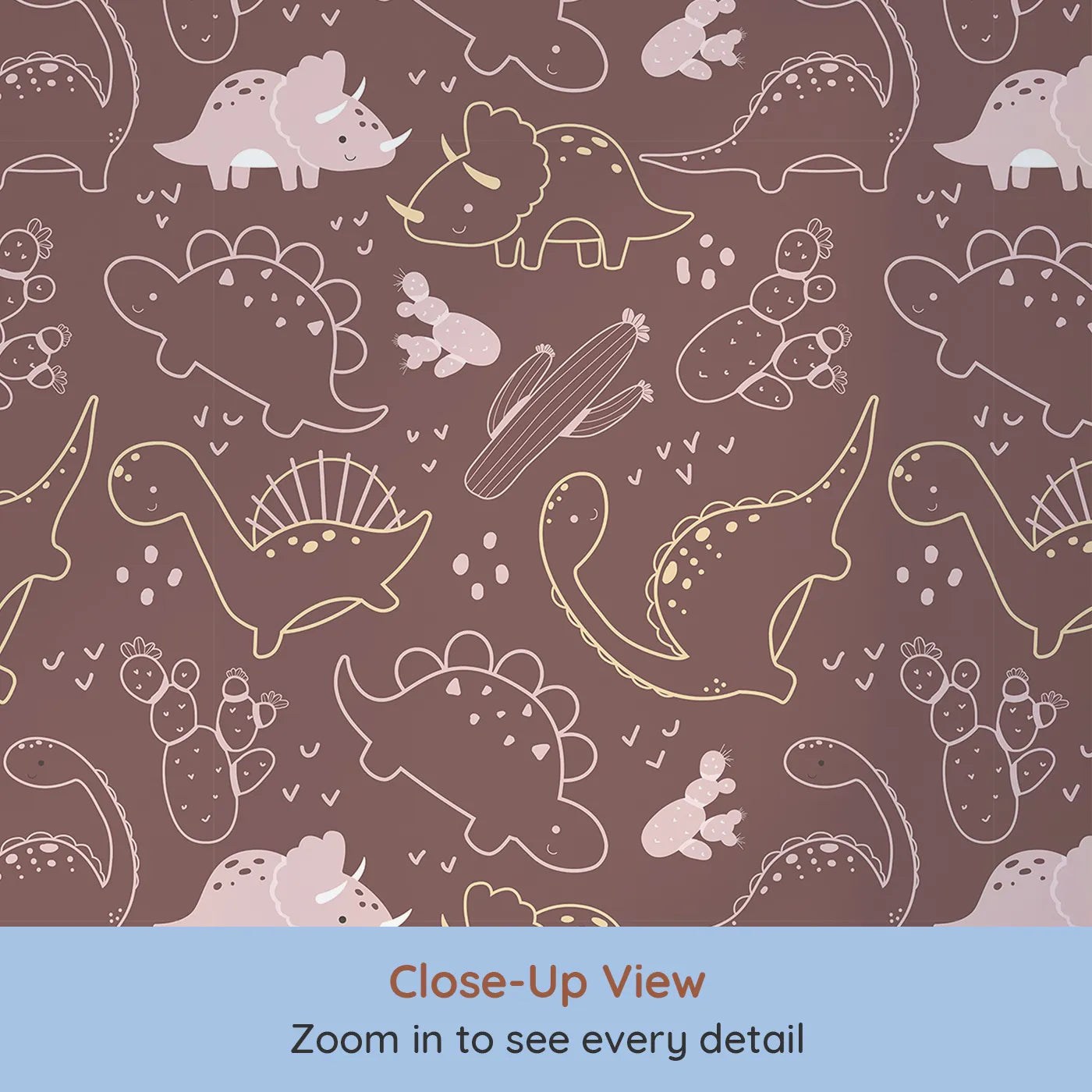 This charming woodland wallpaper features adorable dinosaur silhouettes nestled among delicate cacti. The rich cocoa brown background creates a warm, cozy, and modern feel, perfect for a gender-neutral nursery that is both stylish and reassuring.