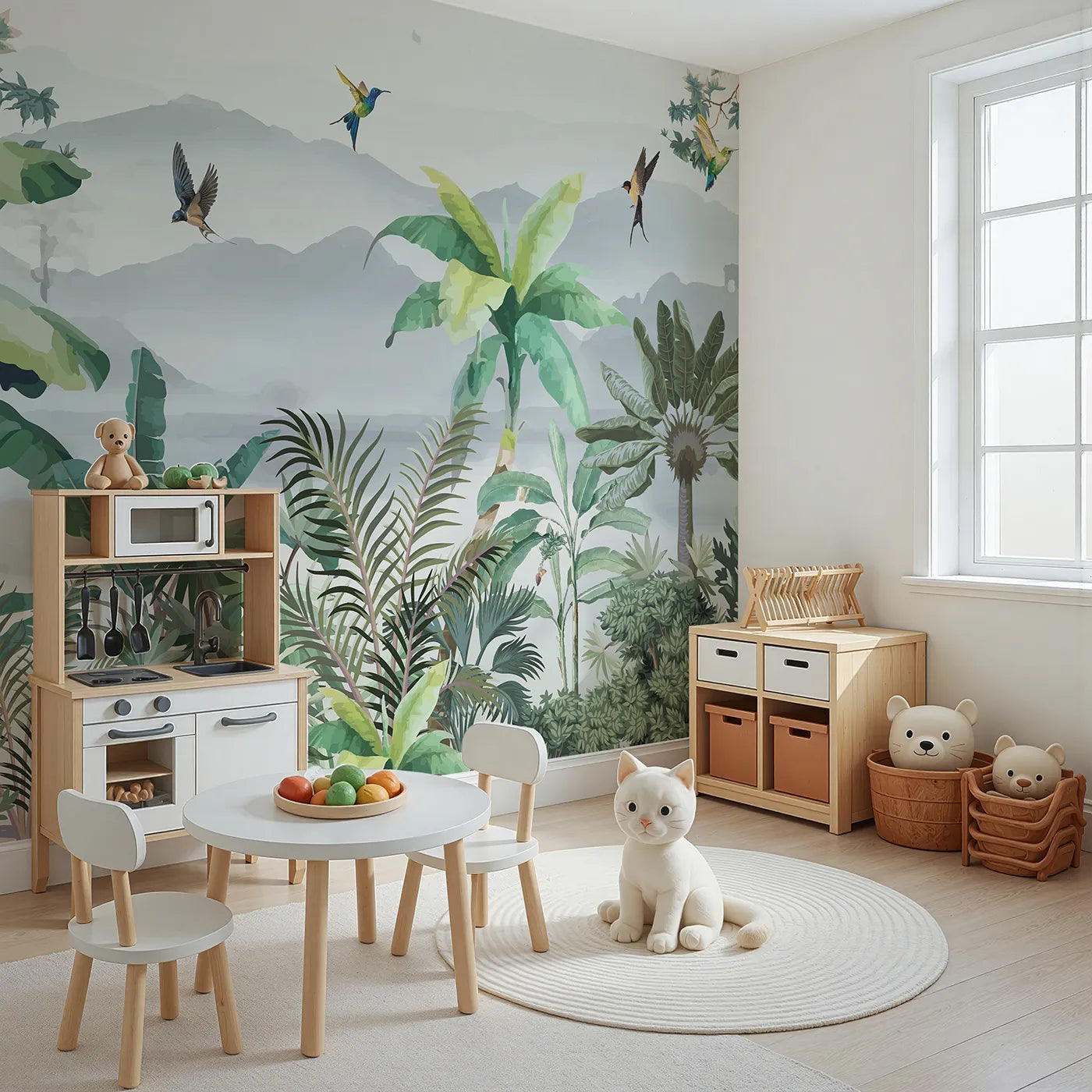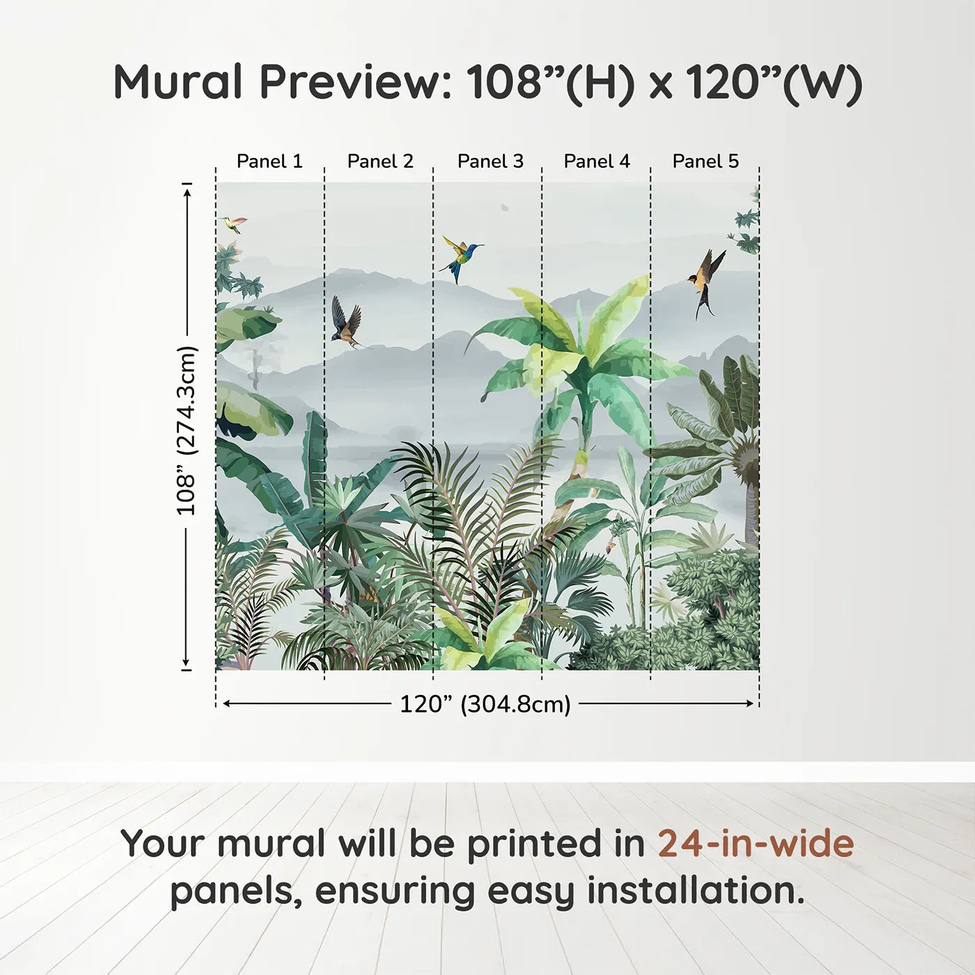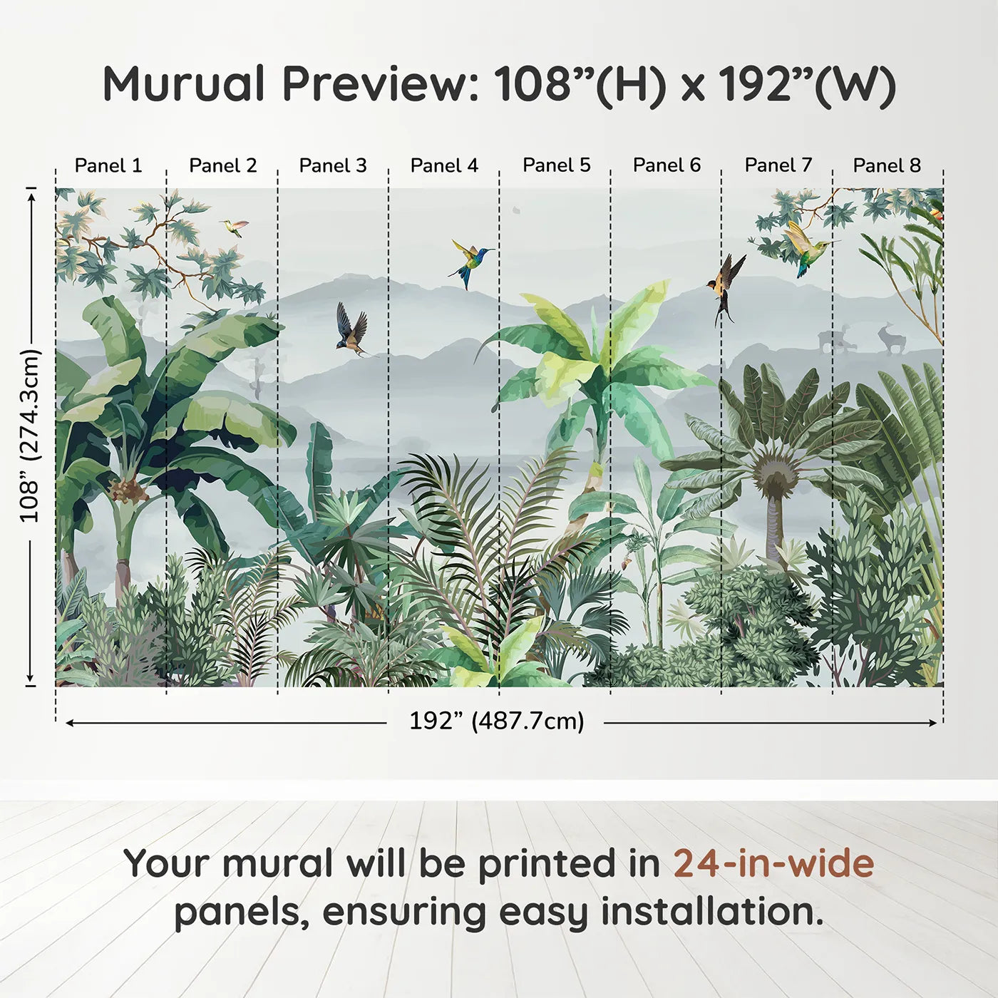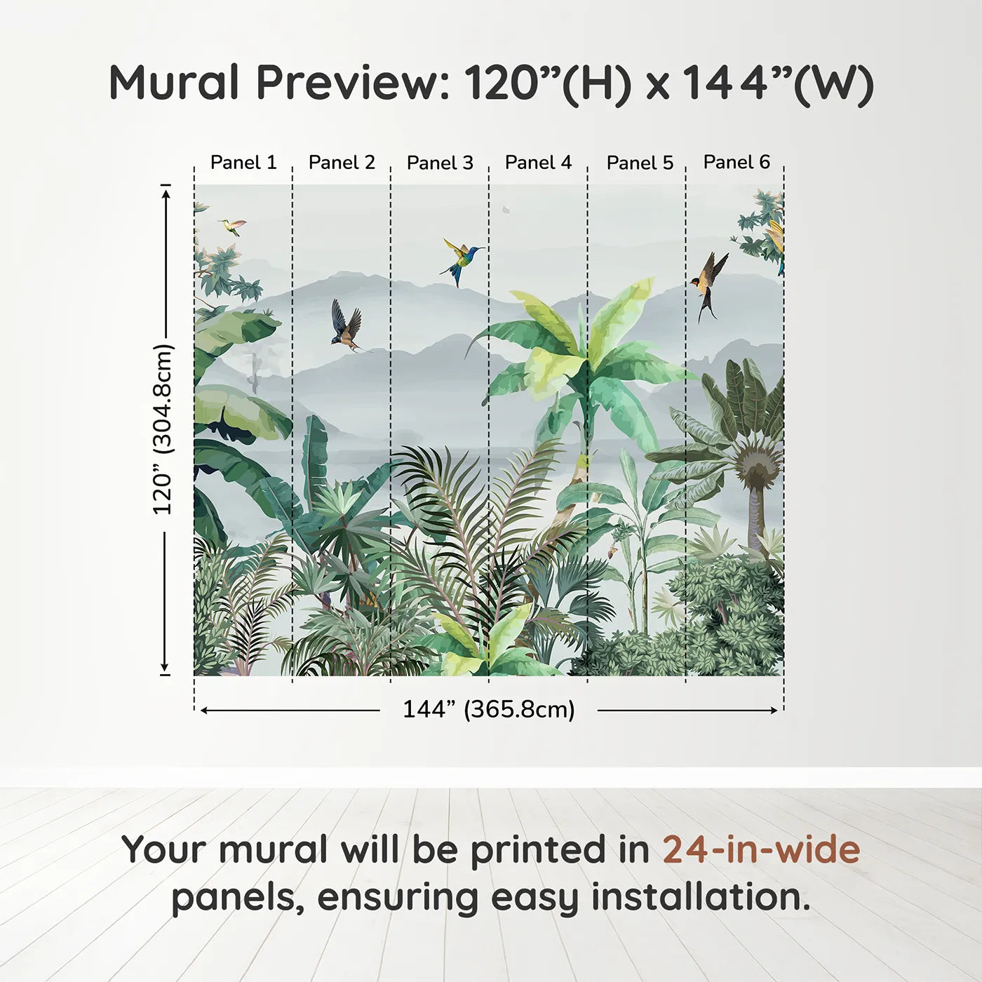 This stunning jungle wall mural captures a breathtaking view from above a misty, tropical canopy. Graceful hummingbirds fly over a dense forest of palm and banana trees, with distant mountains shrouded in fog. The design creates a serene, adventurous, and immersive experience.