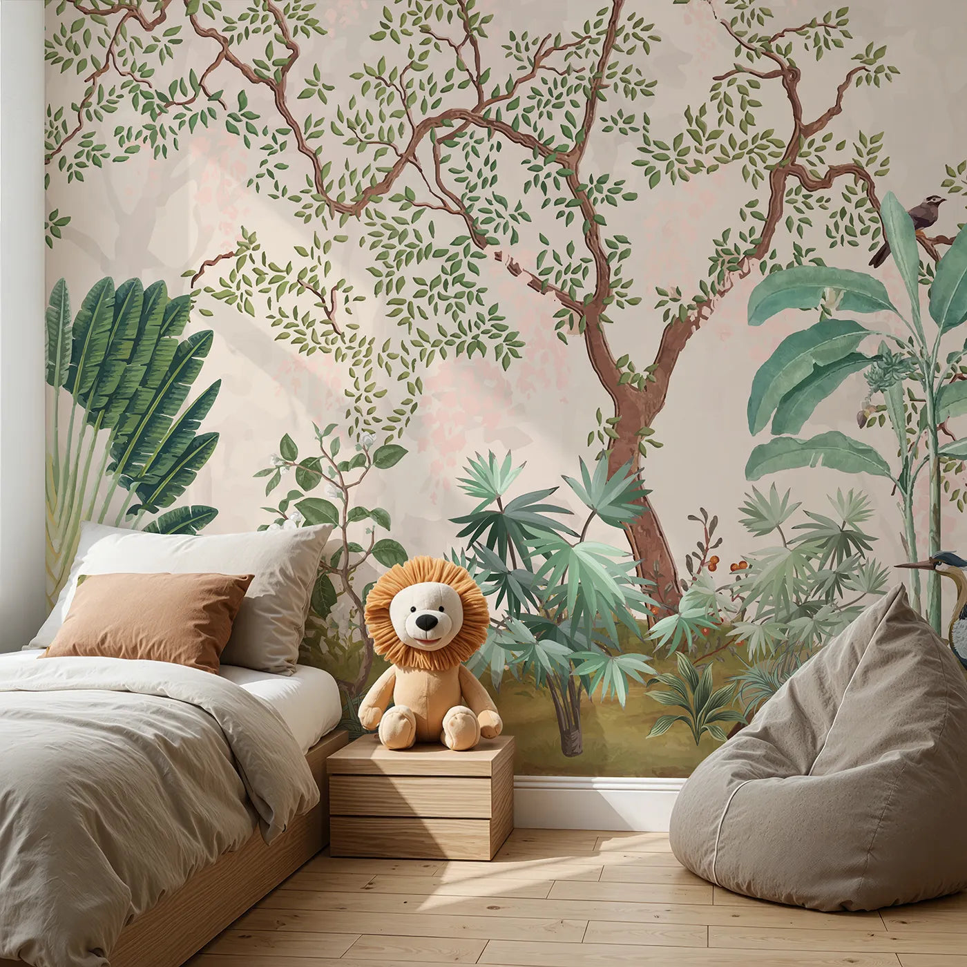 This stunning jungle wall mural brings the deep, lush beauty of a tropical rainforest into their room. Layers of palm trees and jungle foliage in rich shades of green create a dense, atmospheric, and immersive scene. It's a perfect choice for an adventurous child with a love for nature.