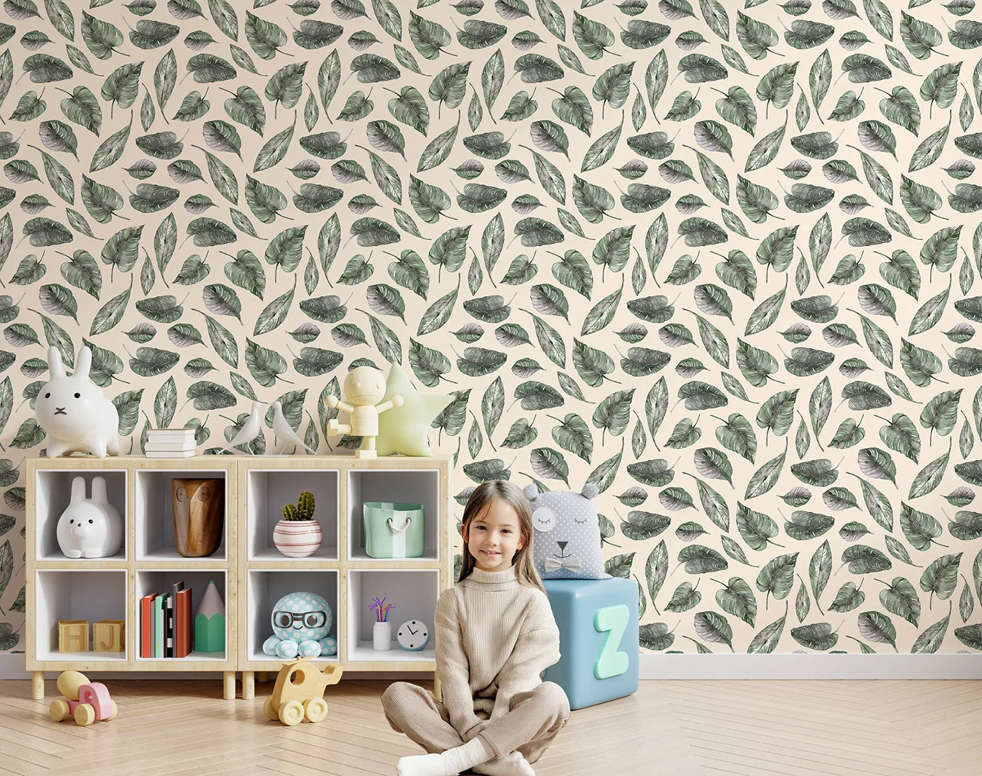 For a room that feels both modern and reassuring, this botanical wallpaper showcases a pattern of large tropical leaves in a soft watercolor green on a warm cream background. Its simple, Scandinavian-inspired design is perfect for a calm and gender-neutral nursery.