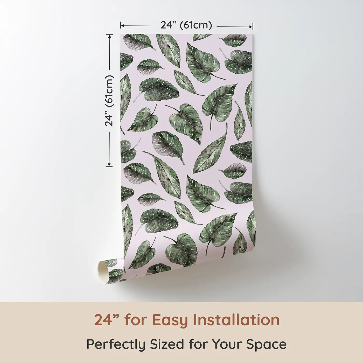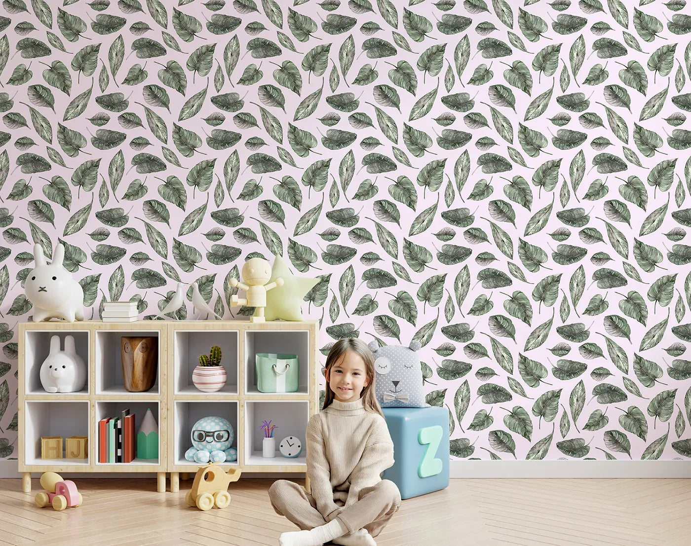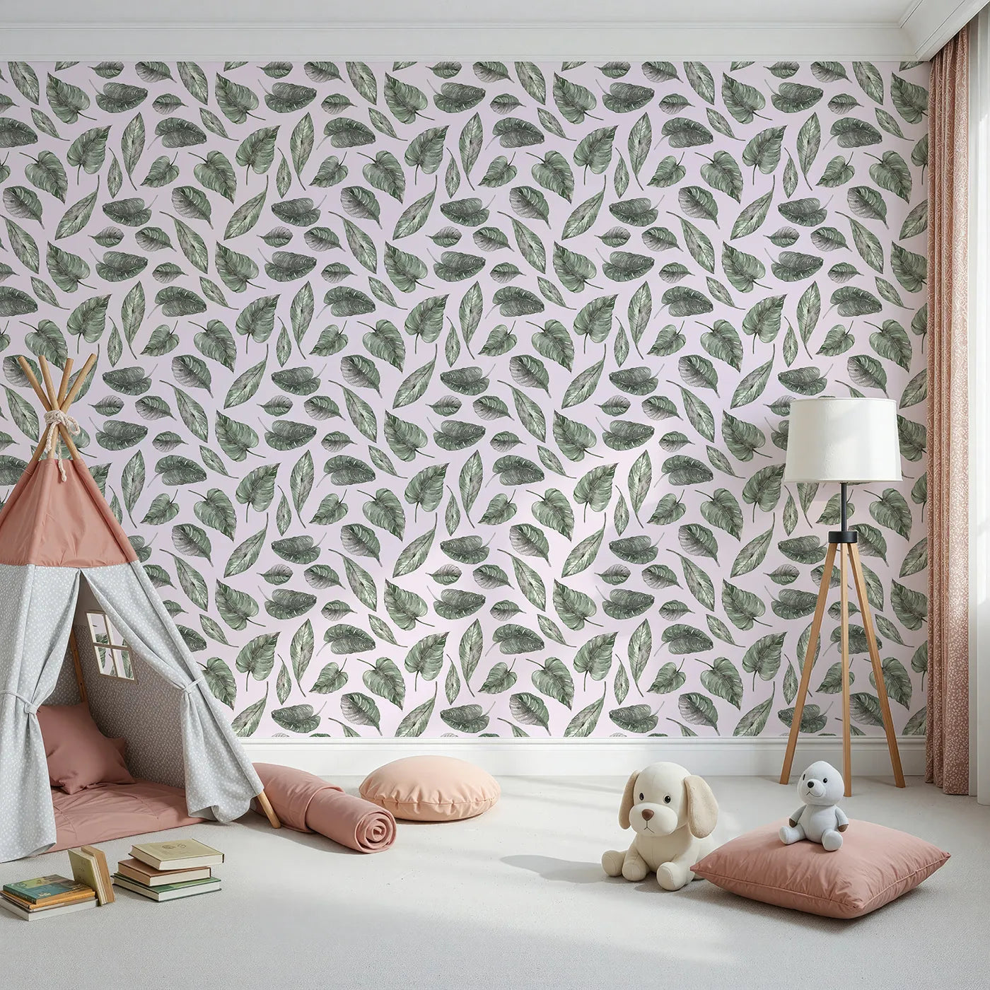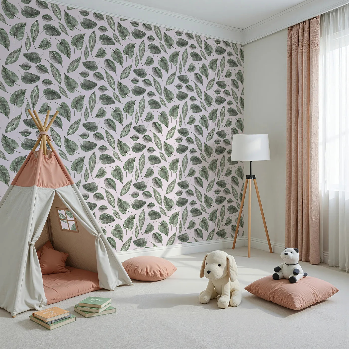 This sweet kids wallpaper features a playful pattern of large tropical leaves in soft watercolor greens, set against a warm blush pink background. The minimalist design adds a modern, botanical touch to any nursery, creating a space that feels both cozy and chic.