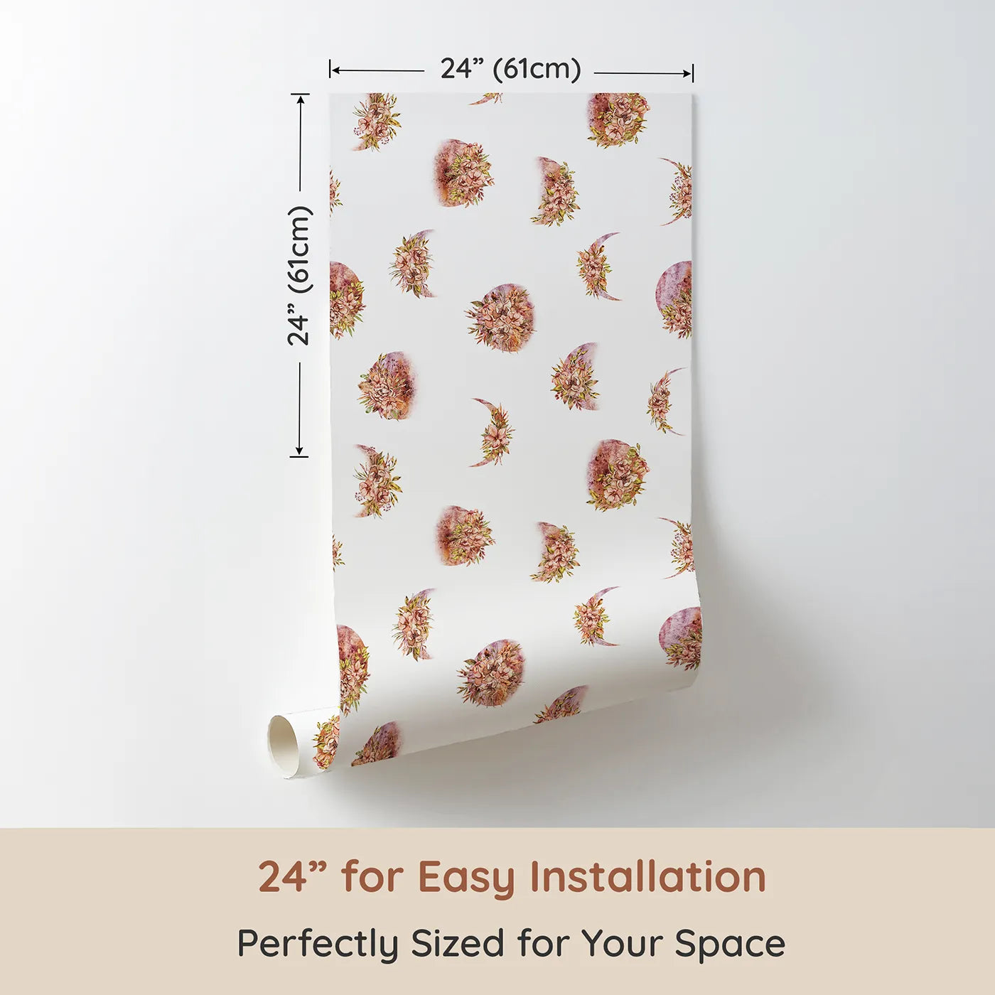 This space wallpaper is a dreamy blend of celestial wonder and botanical beauty. It features lovely watercolor moons in different phases, each adorned with delicate bouquets of flowers in soft, earthy tones. This enchanting pattern creates a magical and calming atmosphere, perfect for a nursery or bedroom.