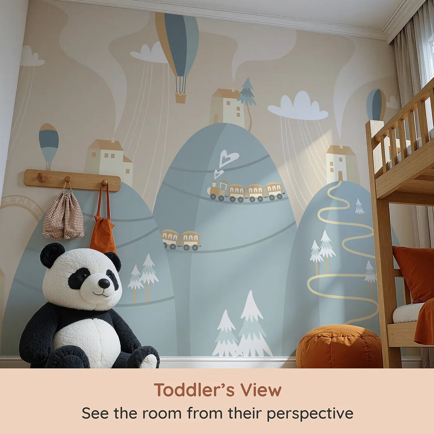 Spark your little one's imagination with this charming train wall mural. A sweet cartoon train chugs along a winding track over rolling, pastel-colored mountains, while hot air balloons drift gently in the sky. This scenic and playful design is perfect for a toddler's room or playroom, inspiring stories of travel and adventure.