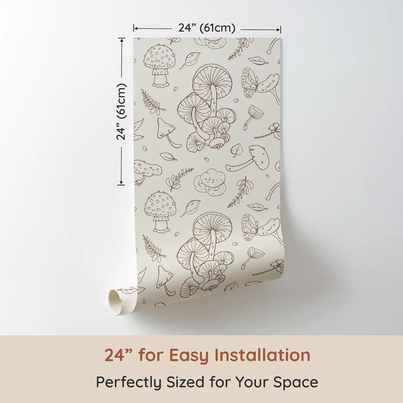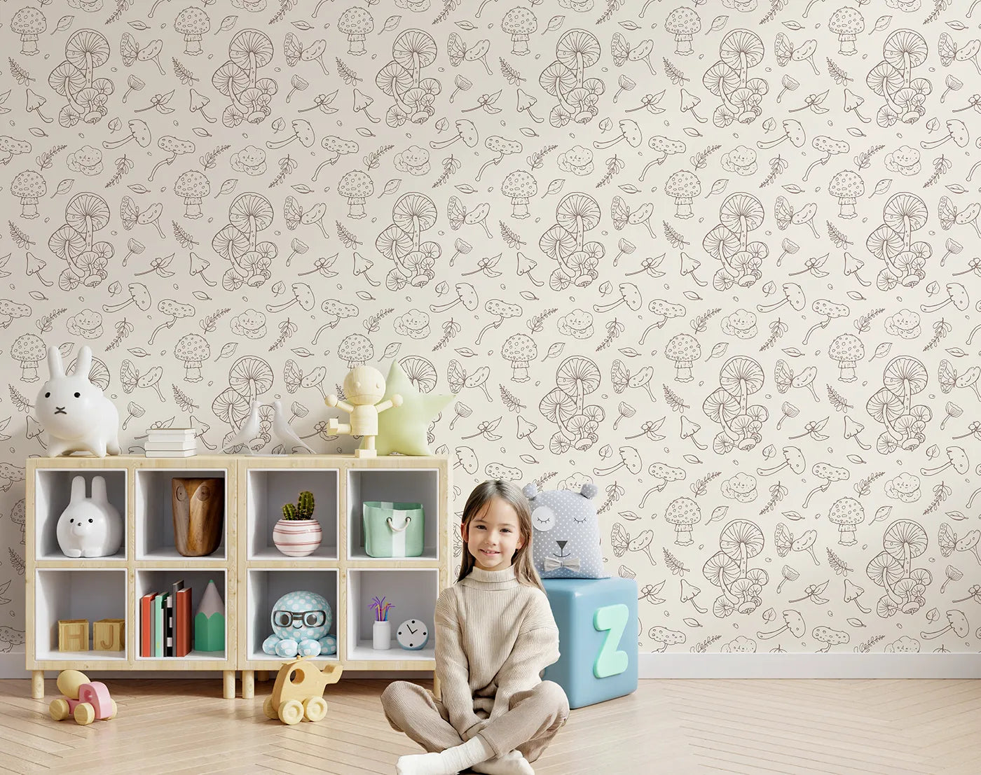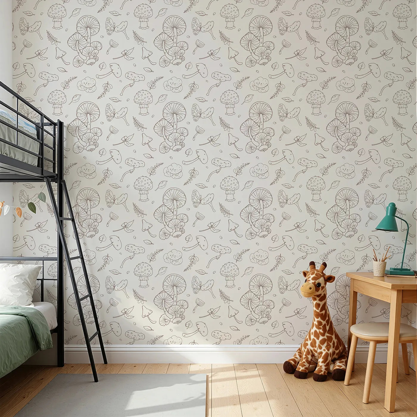 This charming woodland wallpaper features a delicate pattern of hand-sketched mushrooms, butterflies, and forest foliage. The simple brown line art on a soft cream background creates a calm, vintage-inspired feel, perfect for a gender-neutral nursery or a peaceful playroom with a touch of nature.