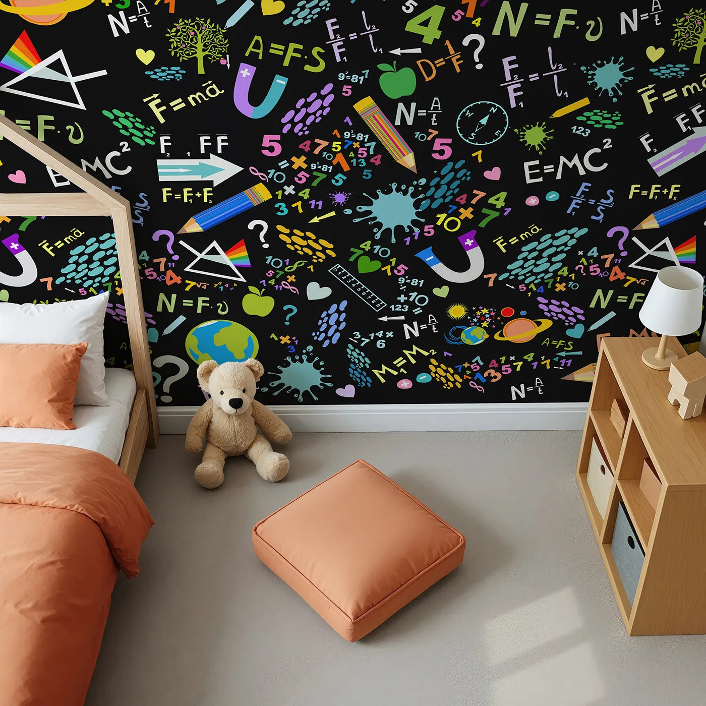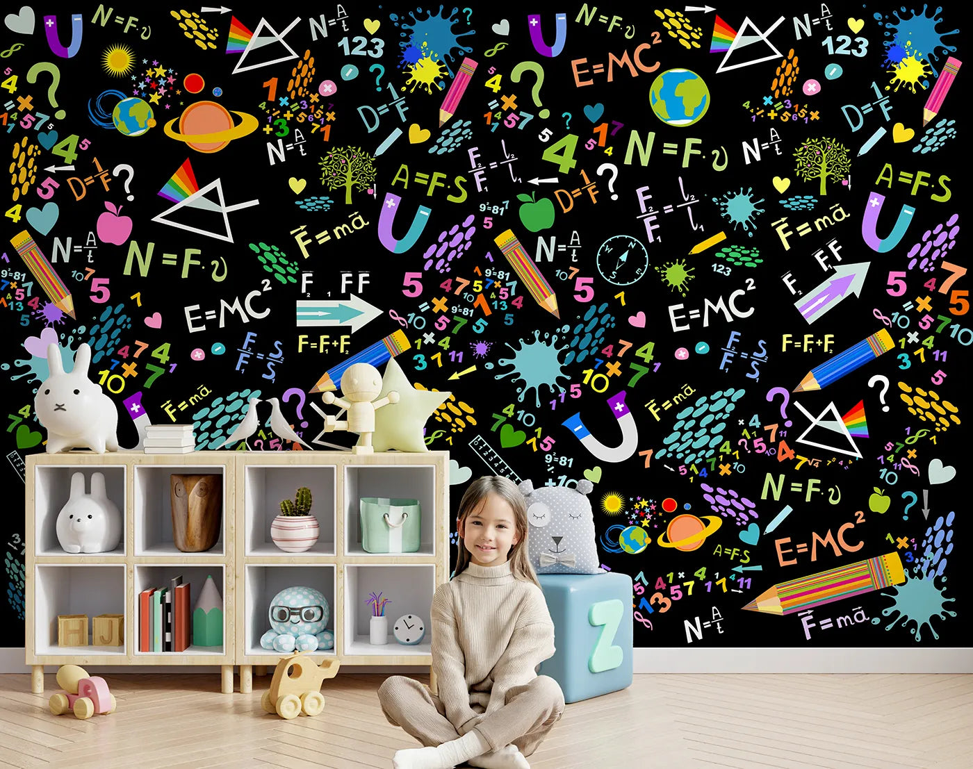 This incredibly fun and energetic wall mural looks like a neon sign explosion of scientific doodles on a black background. Colorful planets, pencils, math equations, and physics diagrams glow with electric color, creating a cool and playful design that makes learning look like an adventure.