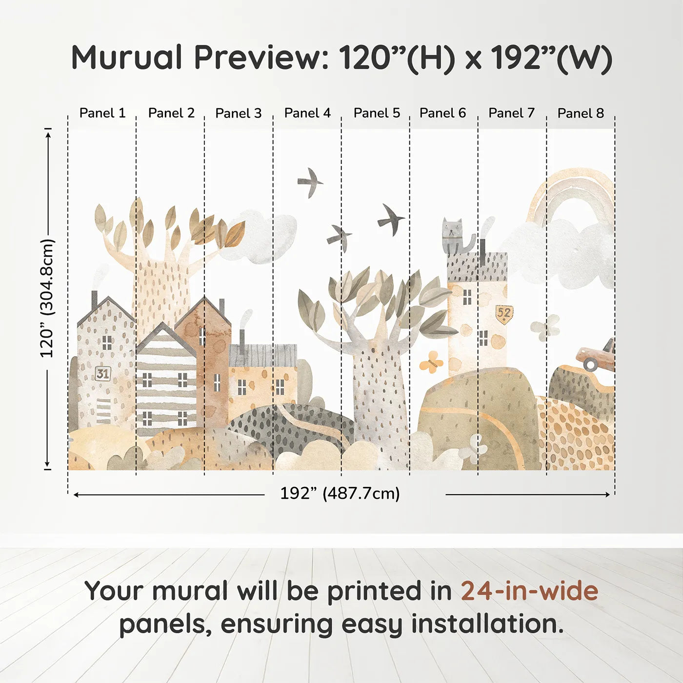 This charming kids wall mural features a row of cozy, watercolor townhouses in soft, neutral earth tones. With sweet details like whimsical trees, a little car, and a faint rainbow, this design creates a comforting and imaginative scene perfect for a modern nursery.