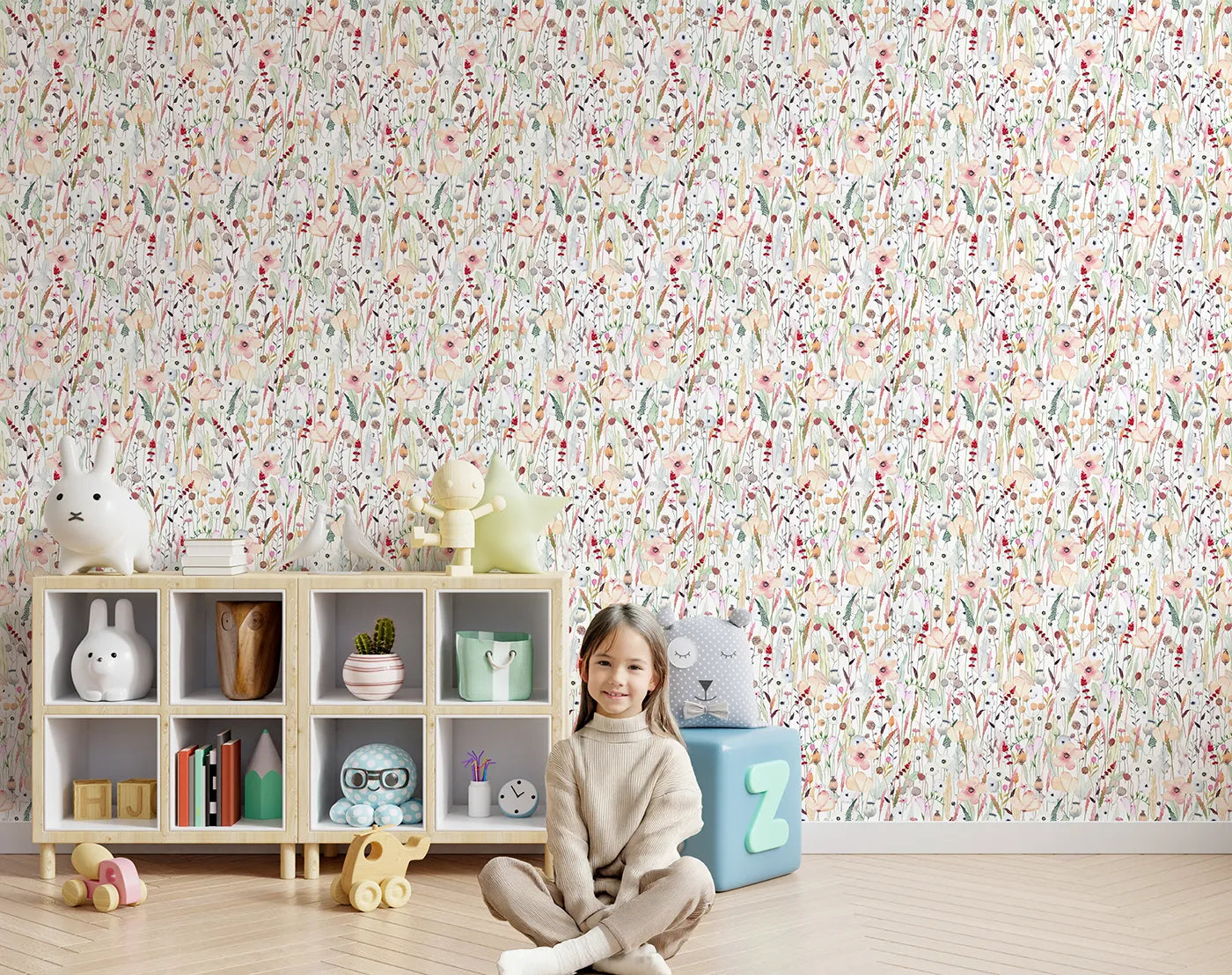 Bring the gentle beauty of a meadow indoors with this beautiful botanical wallpaper. It features a delicate pattern of wildflowers and leaves, all hand-painted in a soothing palette of earthy greens, creams, and soft reds. This design is perfect for creating a calm, nature-inspired nursery for any gender.