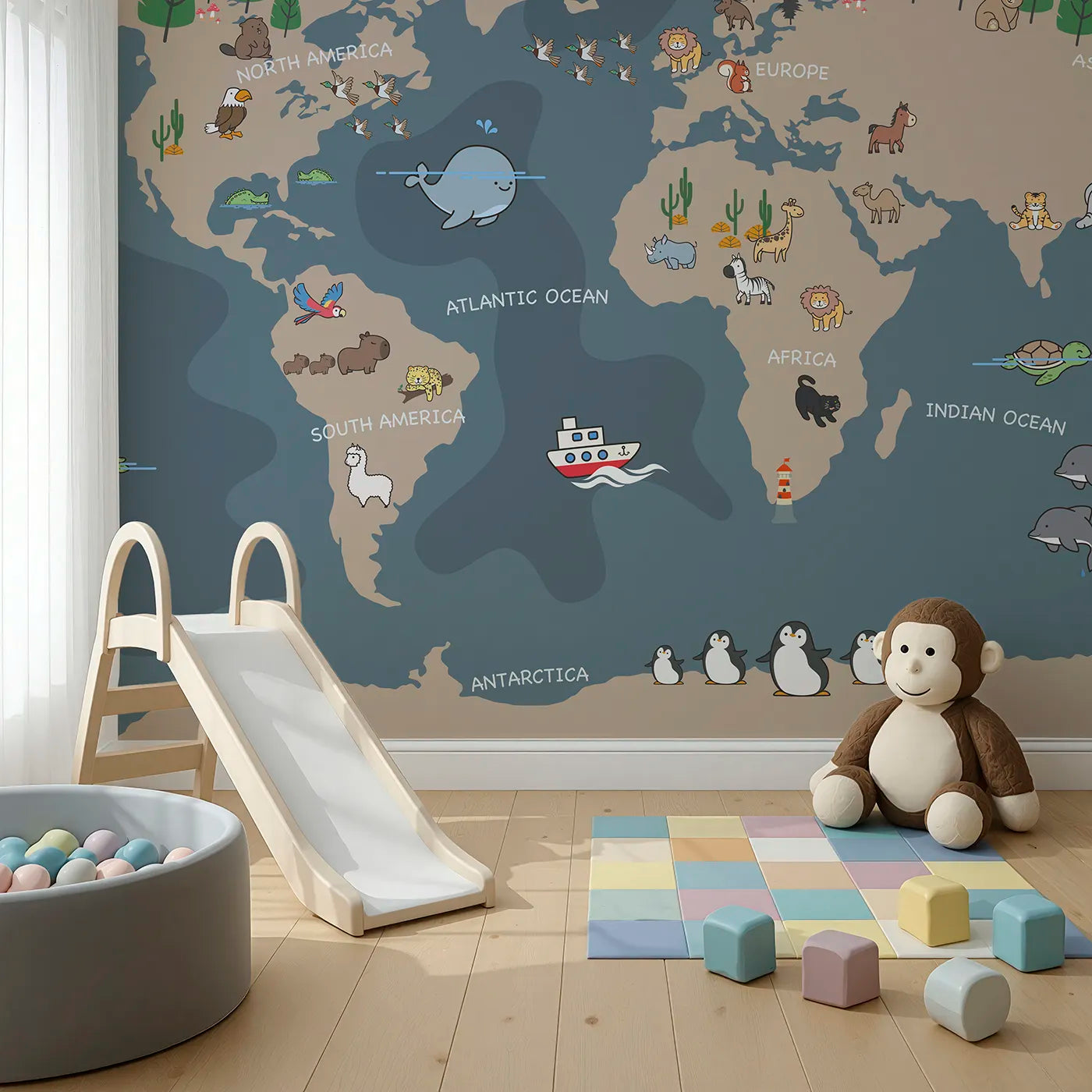 This charming world map wall mural is a fun and stylish addition to any child's room. Each continent is illustrated with cute cartoon animals against a soft, neutral gray background. The modern color palette makes learning about geography a chic and joyful adventure.