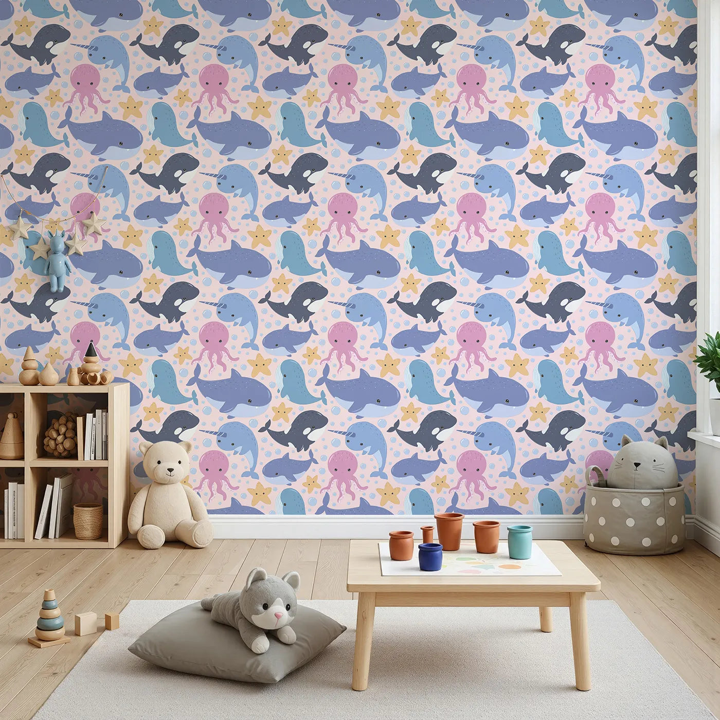 This adorable girls wallpaper features a collection of cute sea animals, including a whale, narwhal, and octopus, on a soft blush pink background. The sweet color palette and friendly characters create a warm and imaginative atmosphere, perfect for a nursery or playroom with an ocean theme.