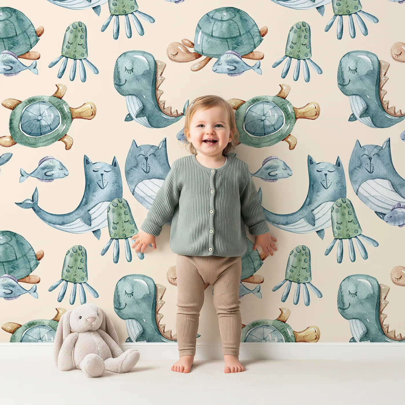 Ocean Daydream Creatures Wallpaper in Cream - A Cozy Daydream with Ocean Friends