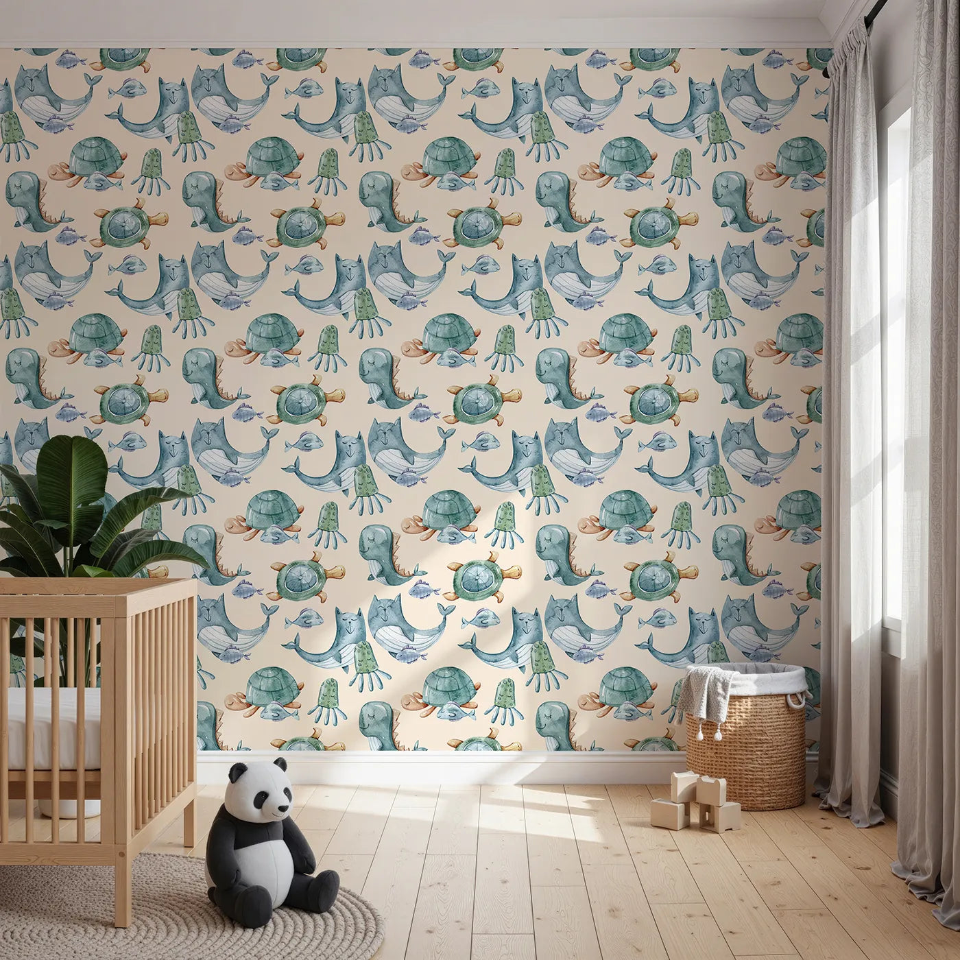 Create a cozy and playful backdrop with this charming animal wallpaper. Gentle watercolor turtles, whales, and jellyfish float through a warm cream sky filled with fluffy clouds. This gender-neutral wallpaper is perfect for sparking sweet, imaginative dreams.