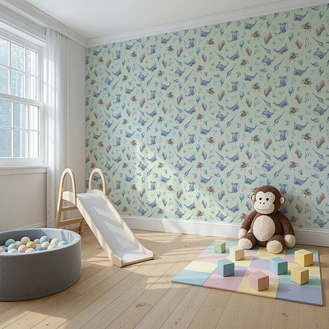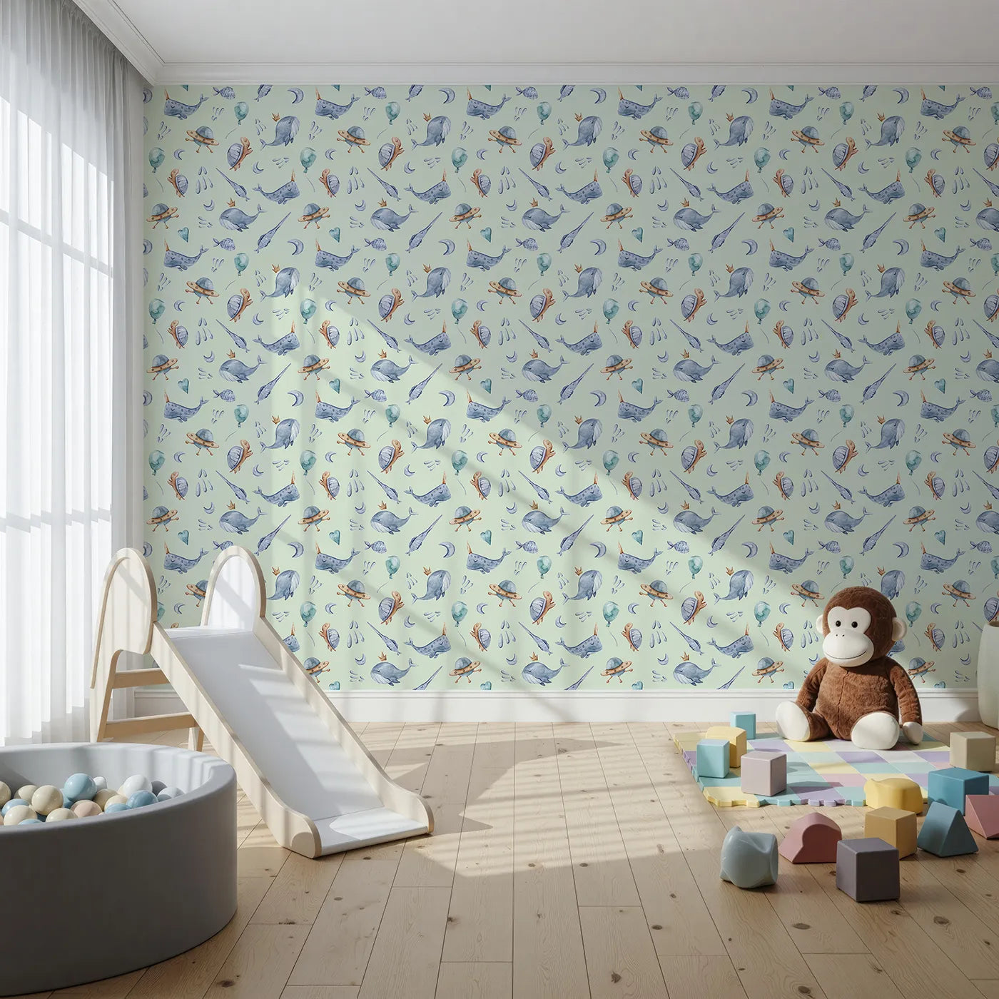 This imaginative kids wallpaper is a playful mashup of ocean and space on a fresh mint green background! It features sweet narwhals, crowned whales, and friendly turtles floating alongside little UFOs, moons, and balloons. The fun watercolor design creates a whimsical backdrop for a playroom or bedroom.