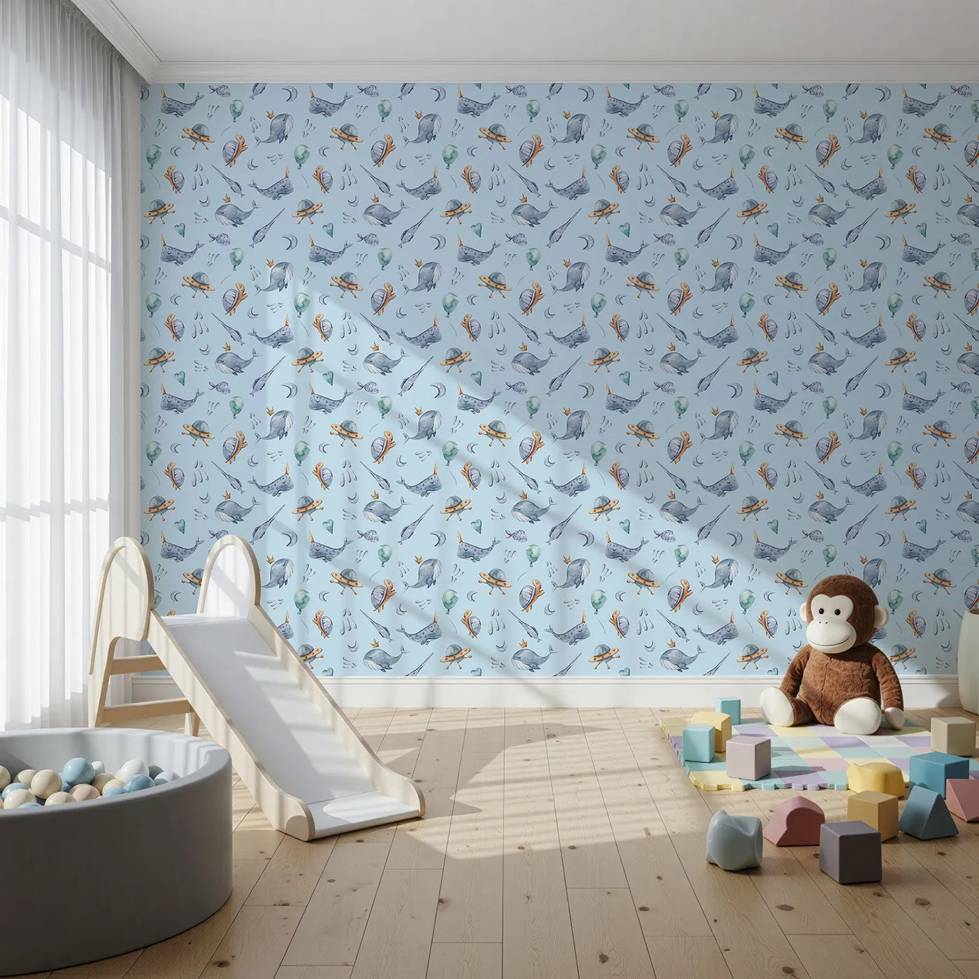 This imaginative kids wallpaper is a playful mashup of ocean and space on a sky blue background! It features sweet narwhals, crowned whales, and friendly turtles floating alongside little UFOs, moons, and balloons. The fun watercolor design creates a whimsical backdrop for a playroom or bedroom.