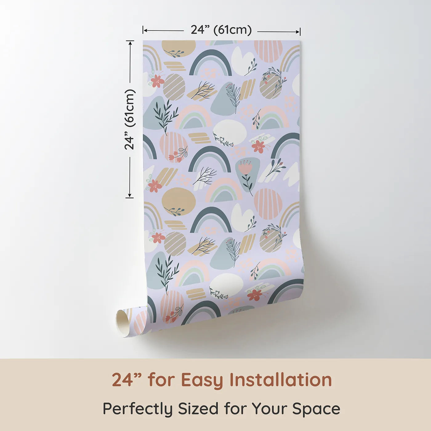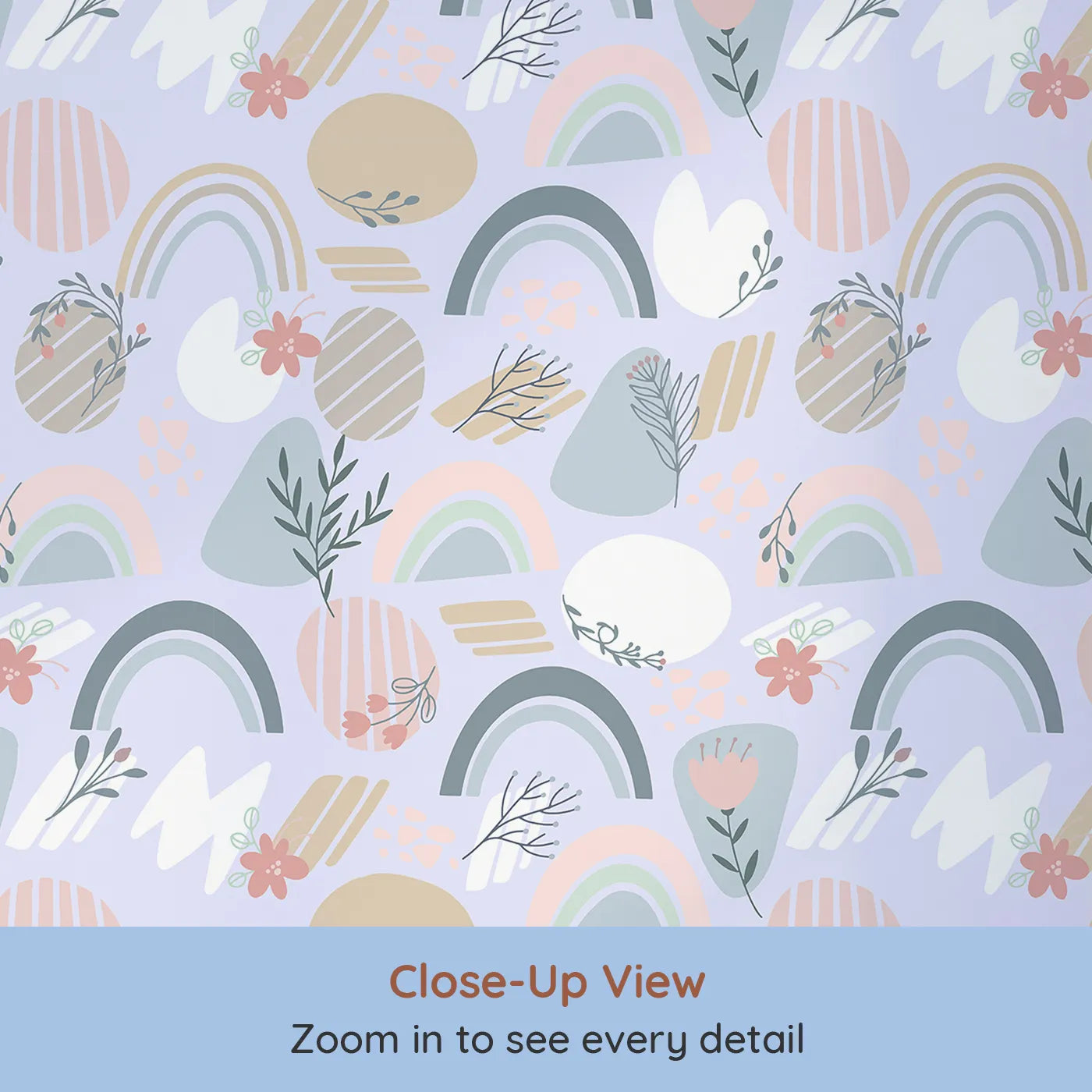 Let their imagination soar with this modern rainbow wallpaper. Featuring a mix of abstract rainbows, floral shapes, and botanicals in soft, calming colors against a lavender background, this design adds a touch of gentle fun to any nursery or playroom. It's a sweet and stylish way to brighten their space.