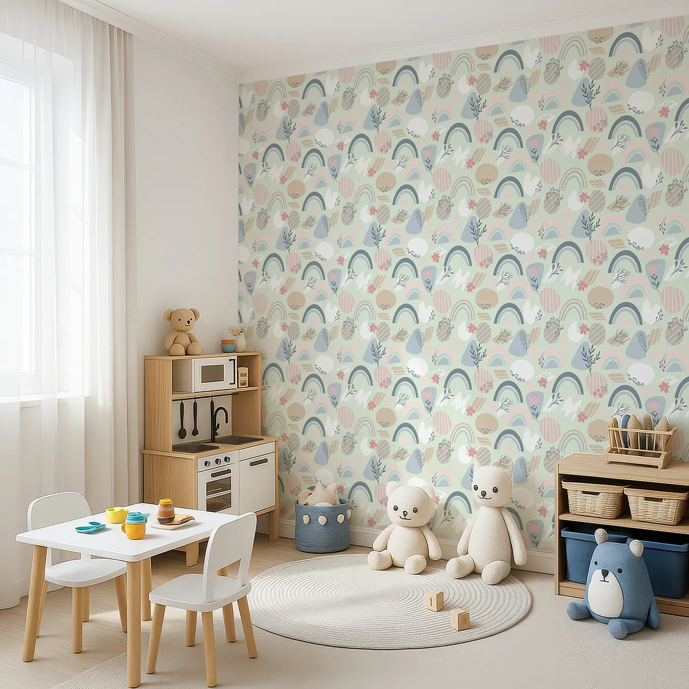 Let their imagination soar with this modern rainbow wallpaper. Featuring a mix of abstract rainbows, floral shapes, and botanicals in soft, calming colors against a mint green background, this design adds a touch of gentle fun to any nursery or playroom. It's a sweet and stylish way to brighten their space.