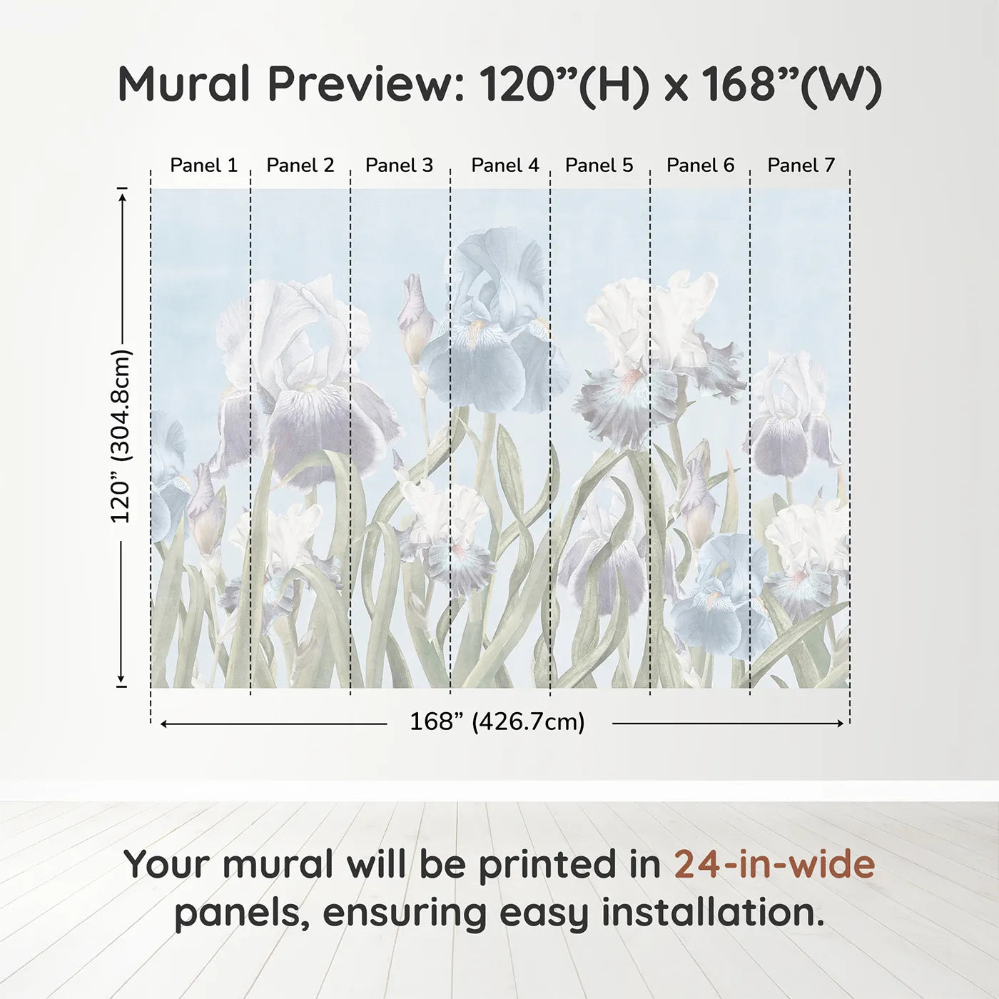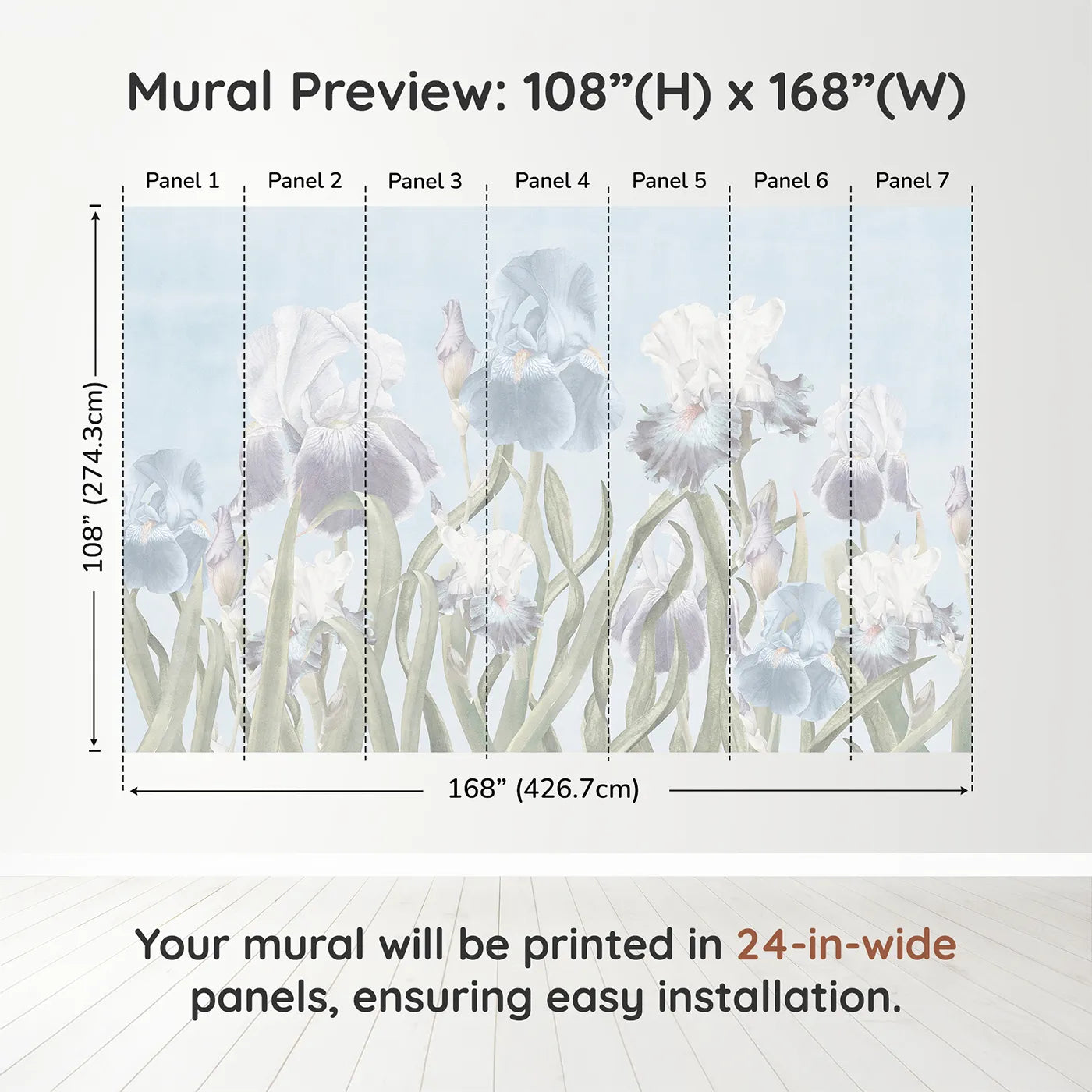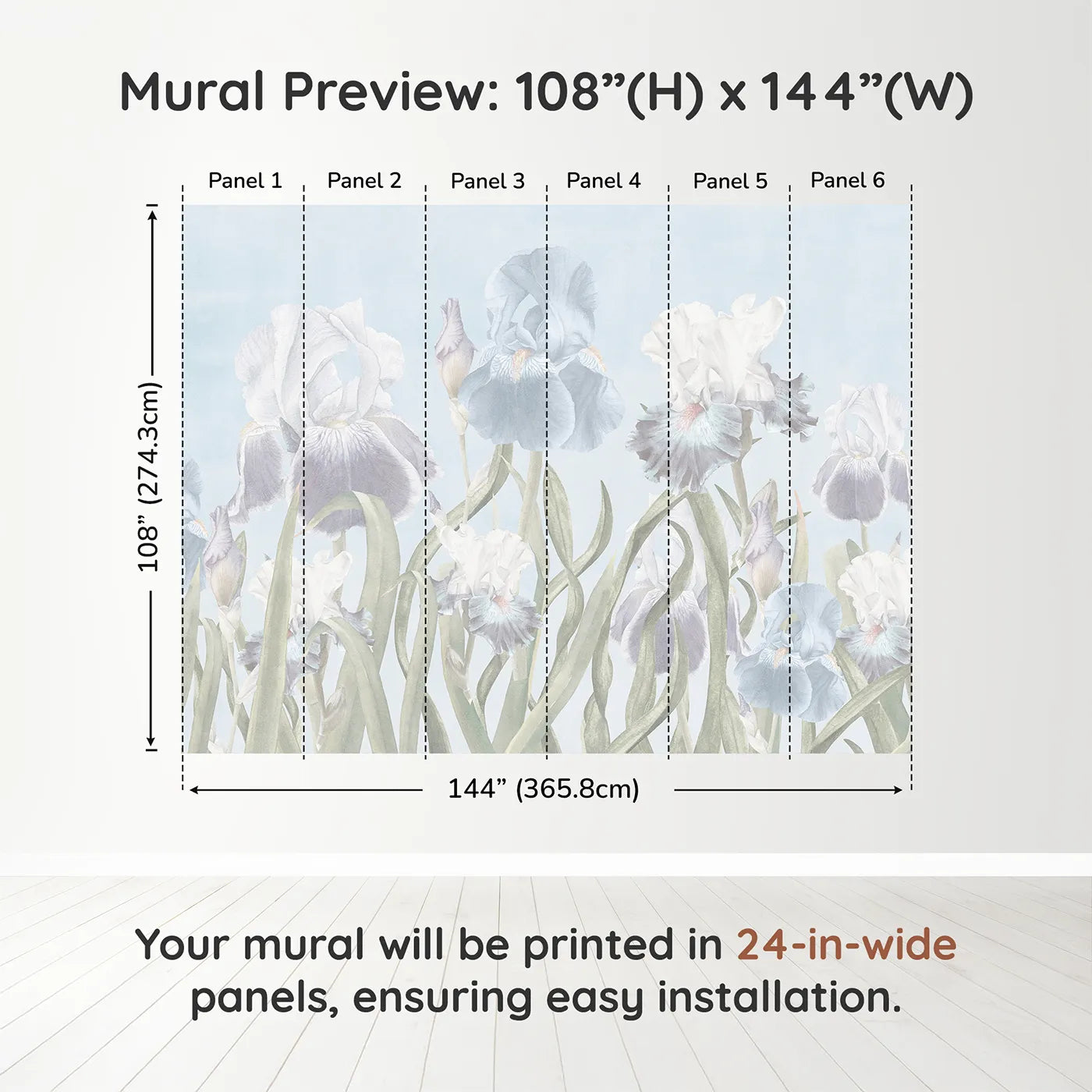 This beautiful and serene floral wall mural features a field of iris flowers in a soft, dreamy pastel palette. The gentle, painterly style and calming colors create a peaceful and romantic atmosphere, perfect for a soothing nursery or a child's room with a touch of artistic elegance.