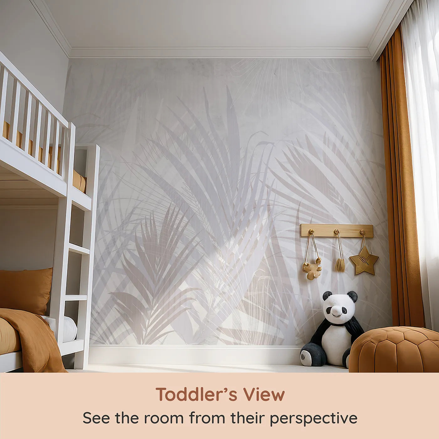 This beautiful botanical wallpaper brings a soft, modern touch to any room. A variety of delicate palm leaves in pastel shades of blush pink, lilac, and soft gray overlap to create a dreamy, textured look. It's a chic and calming design for a sophisticated nursery or child's room.