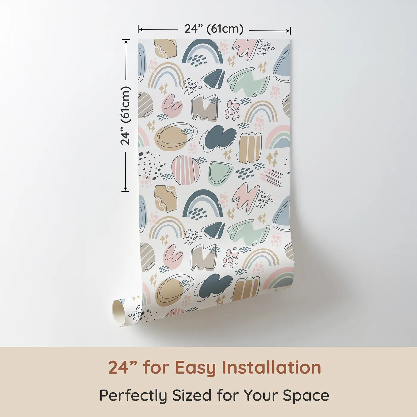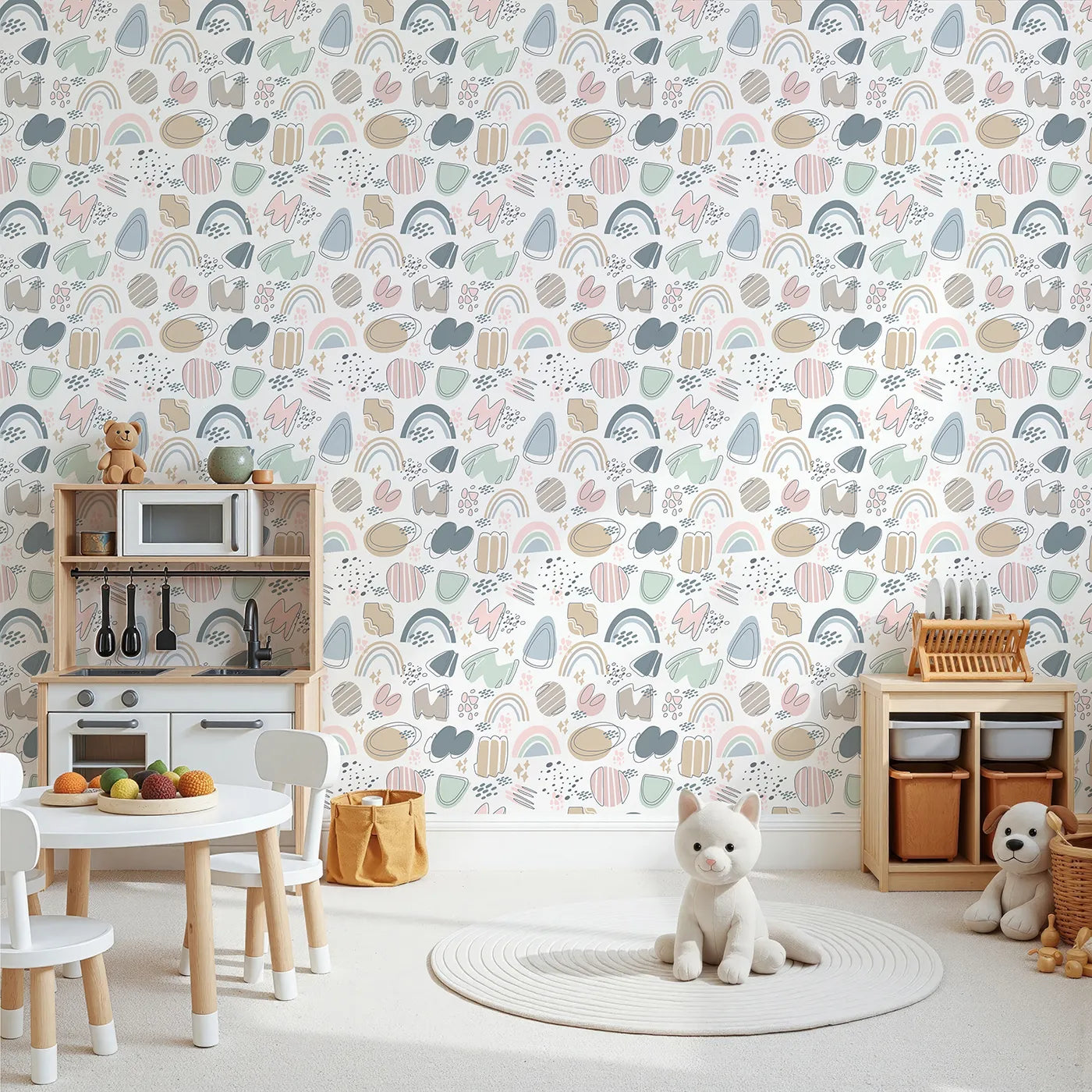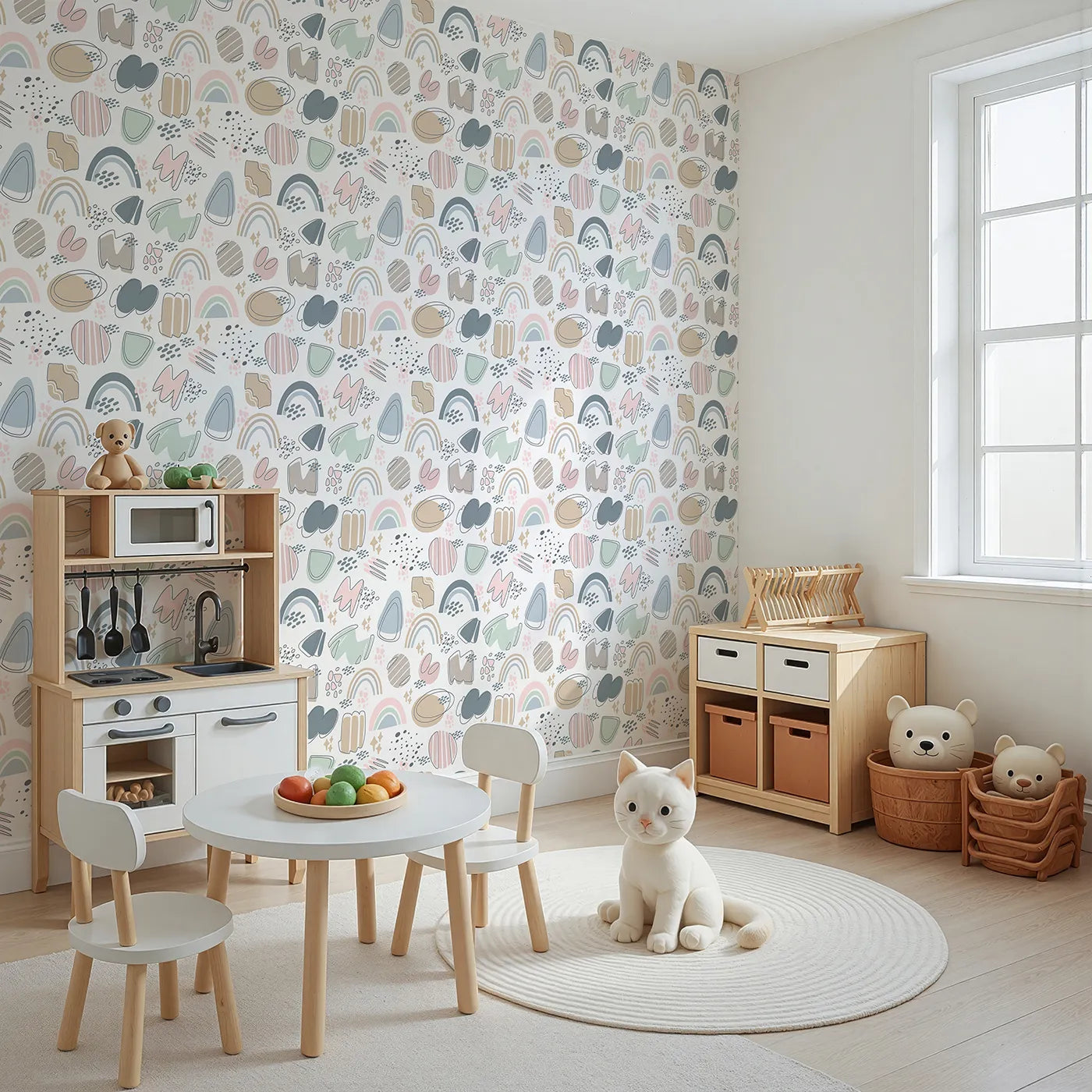 Create a calm and imaginative space with this charming kids wallpaper. Featuring a playful mix of soft pastel rainbows, gentle scribbles, and modern abstract shapes, it adds a touch of whimsical artistry to any nursery or playroom. The soothing color palette creates a serene backdrop for both rest and play.