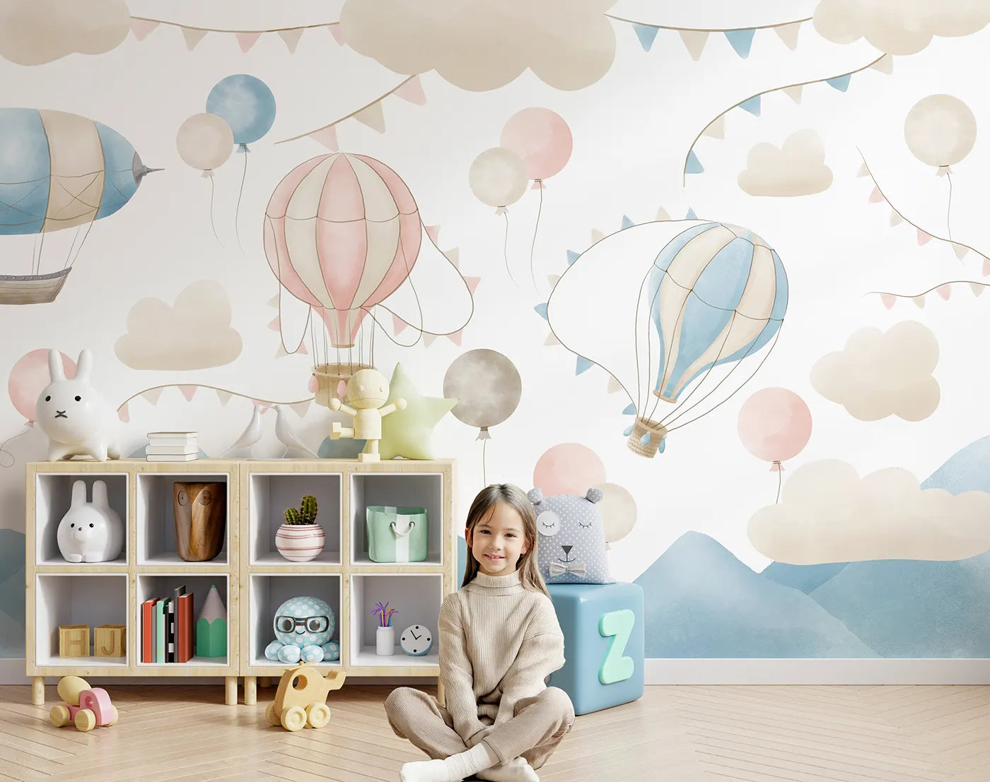Pastel Sky Balloon Parade Wall Mural - A Gentle Parade for a Dreamy Little Adventurer