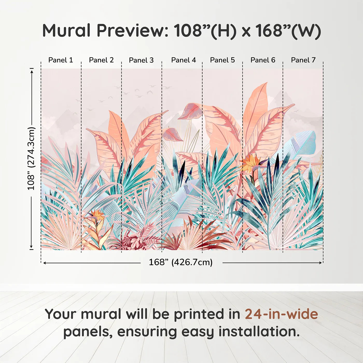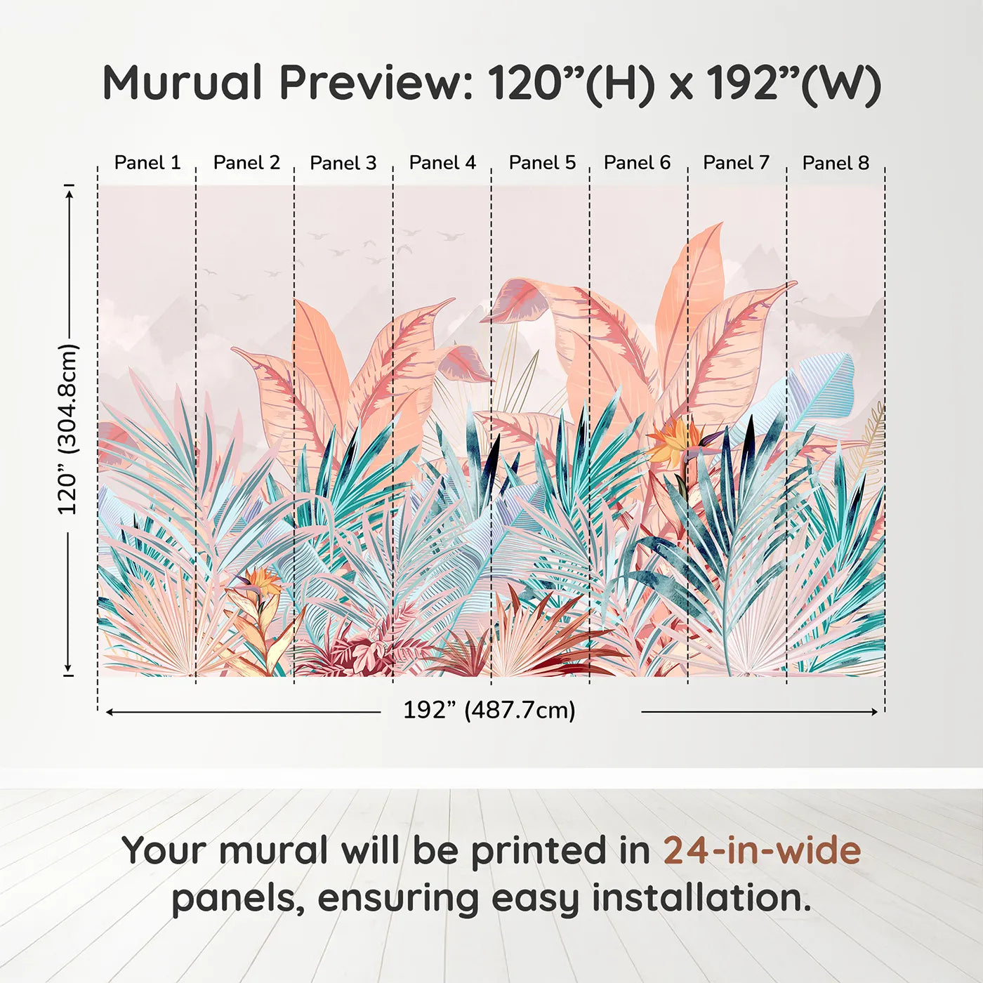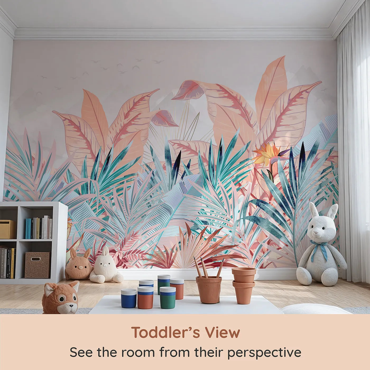 This charming jungle wallpaper brings a soft and modern feel to a tropical theme. This beautiful botanical wall mural features a lush variety of palm and banana leaves in dreamy pastel shades of pink, teal, and soft green. Itβs a calming yet imaginative backdrop for a nursery or playroom.