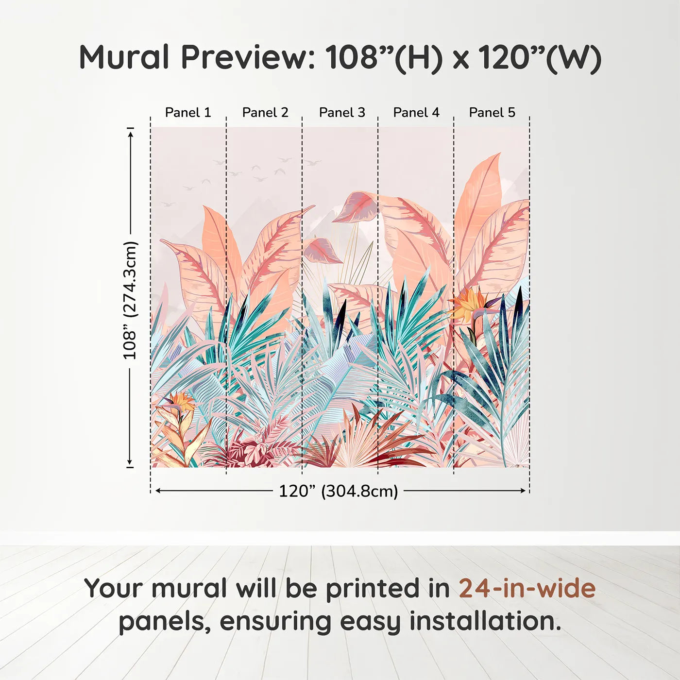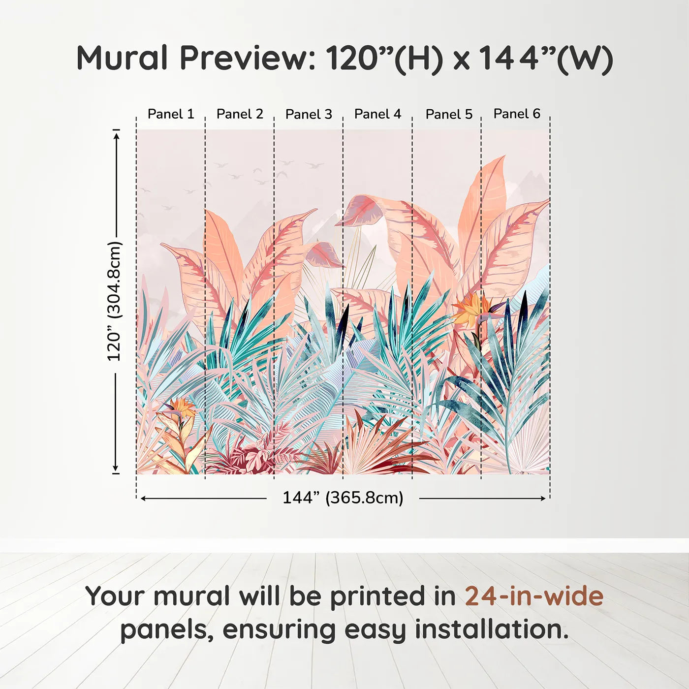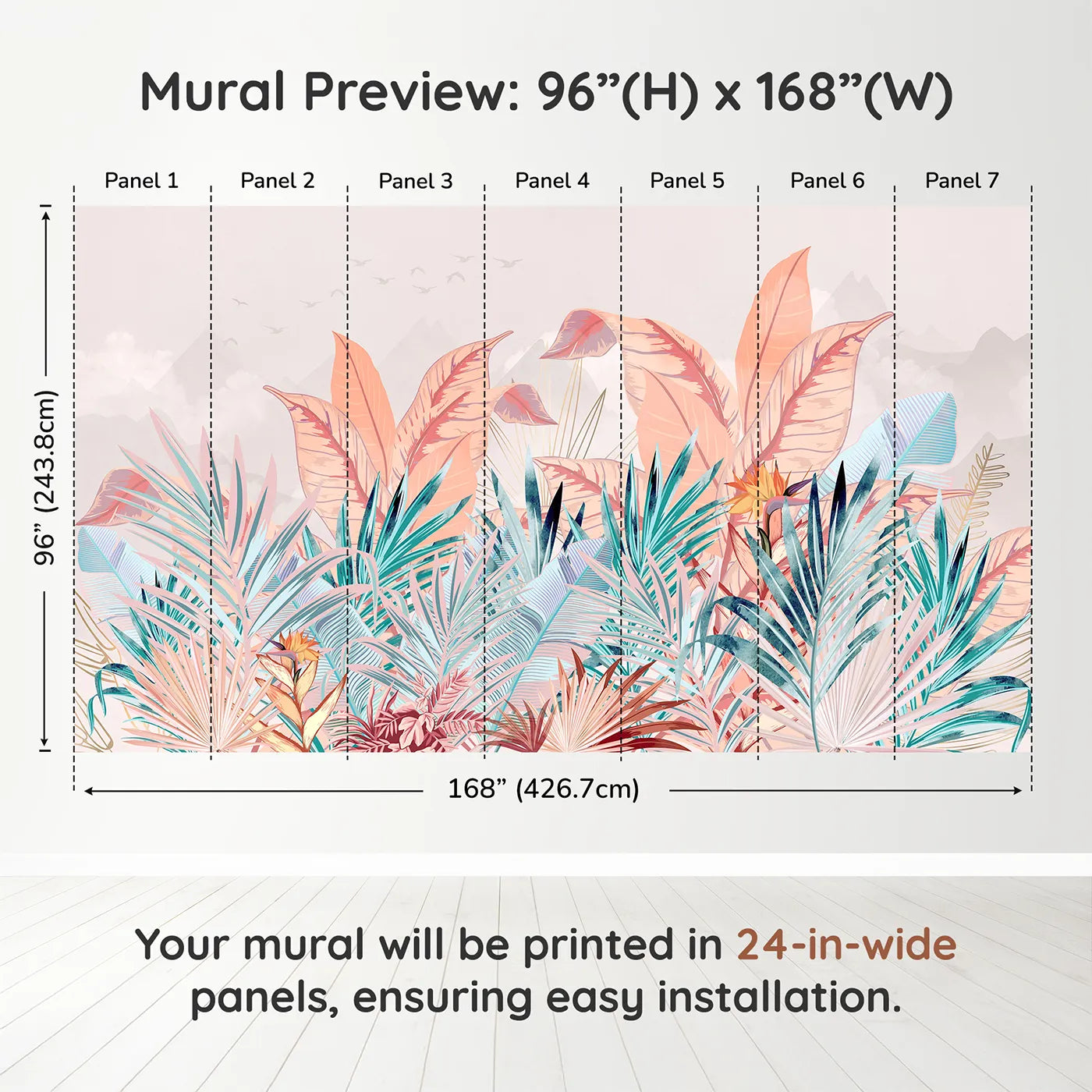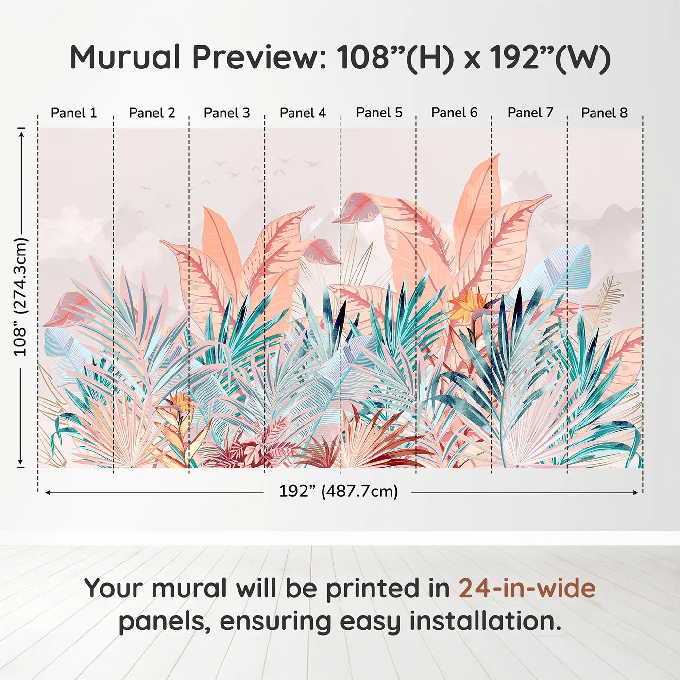 This charming jungle wallpaper brings a soft and modern feel to a tropical theme. This beautiful botanical wall mural features a lush variety of palm and banana leaves in dreamy pastel shades of pink, teal, and soft green. Itβs a calming yet imaginative backdrop for a nursery or playroom.