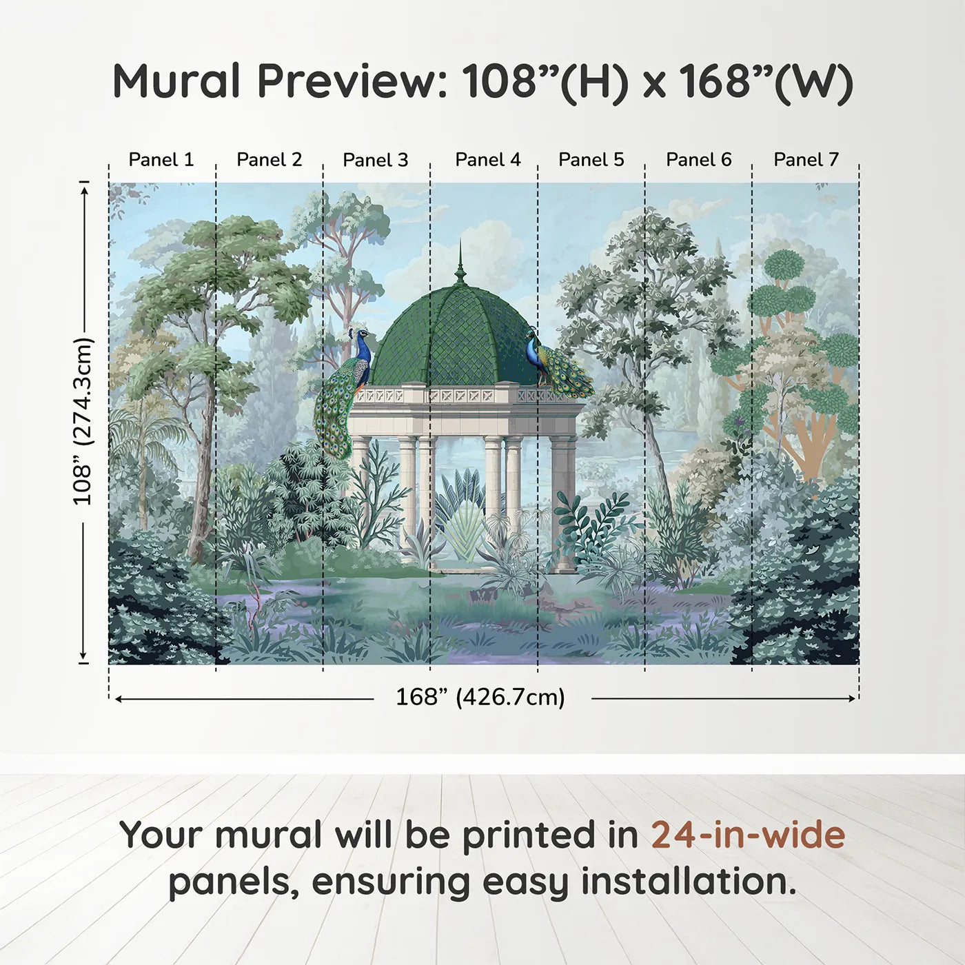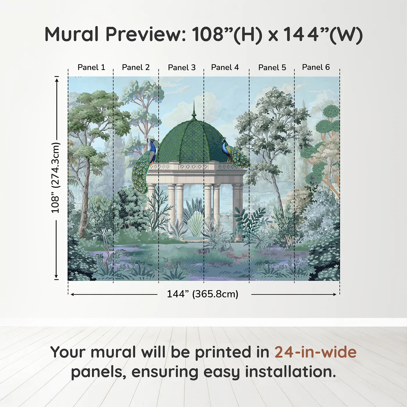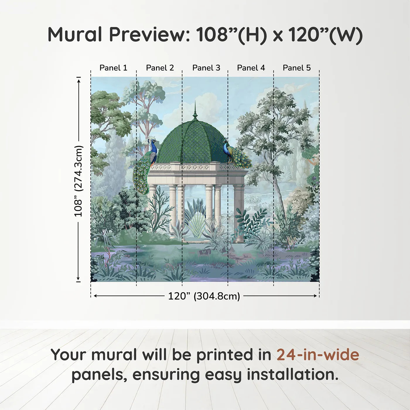 Peacock Pavilion Wall Mural - An Elegant Garden for a Timeless, Grand Room