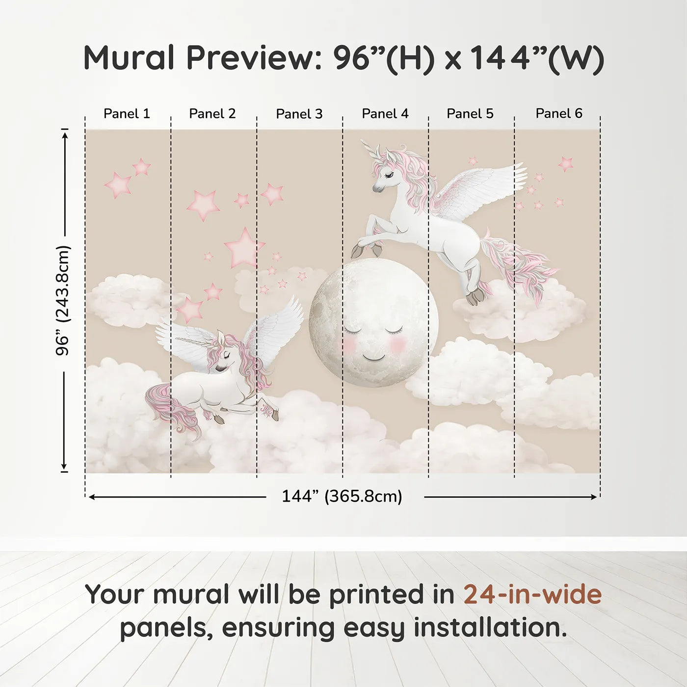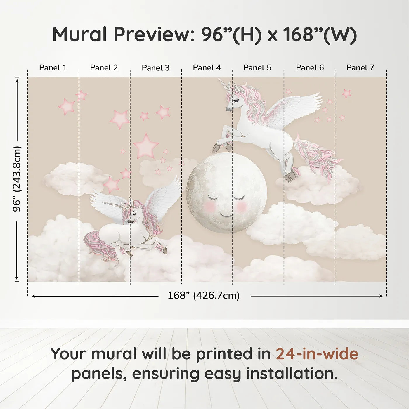 This charming unicorn wall mural brings a touch of celestial magic to any room. Two beautiful winged unicorns, or pegasuses, dance among soft clouds and pink stars, with one leaping gracefully over a sweet, sleeping moon. The soft, neutral background makes the scene truly pop.