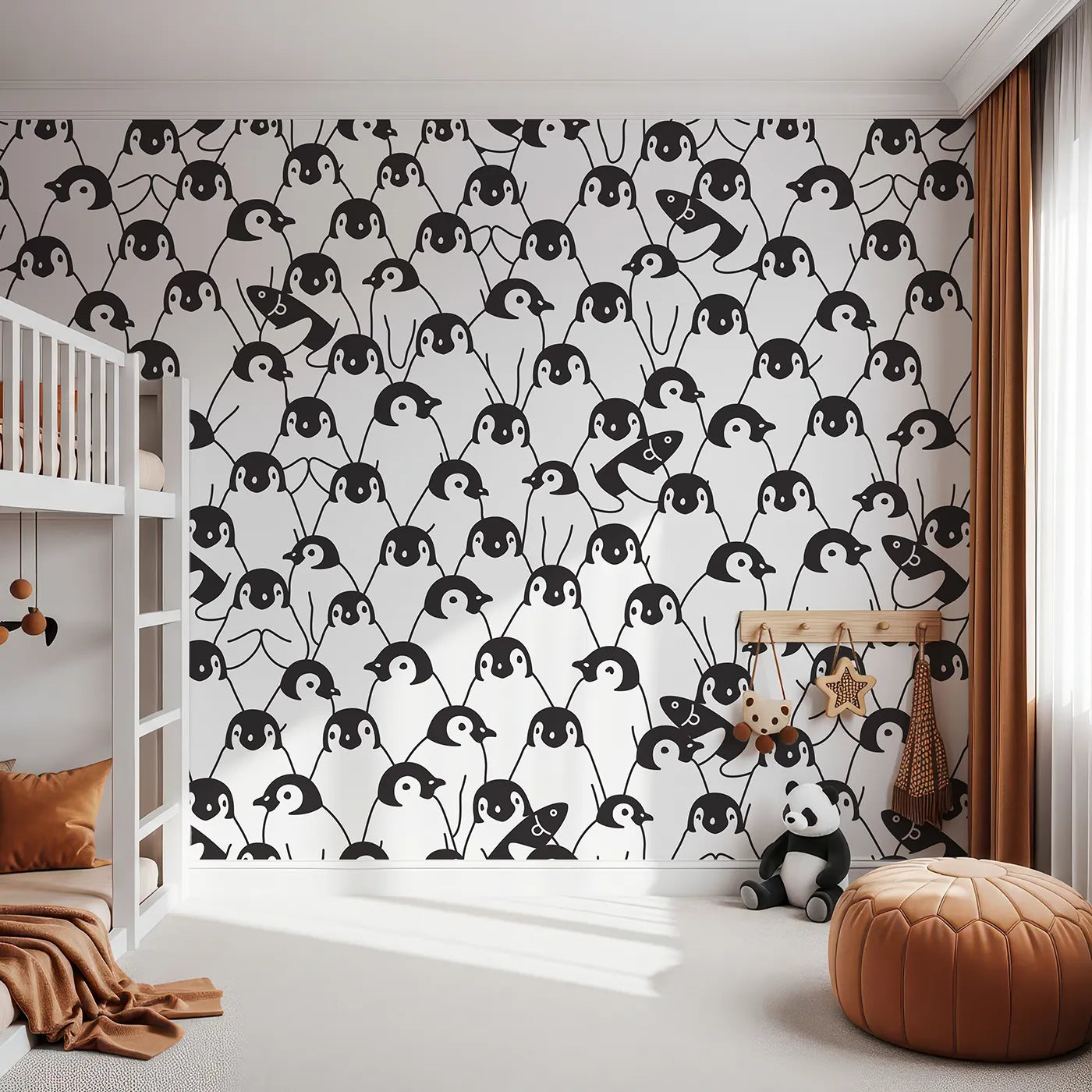 This fun and playful animal wallpaper is covered in a dense, repeating pattern of adorable cartoon penguins. The simple black and white design is modern and bold, creating a whimsical and engaging accent wall for a nursery, playroom, or kid's bathroom.