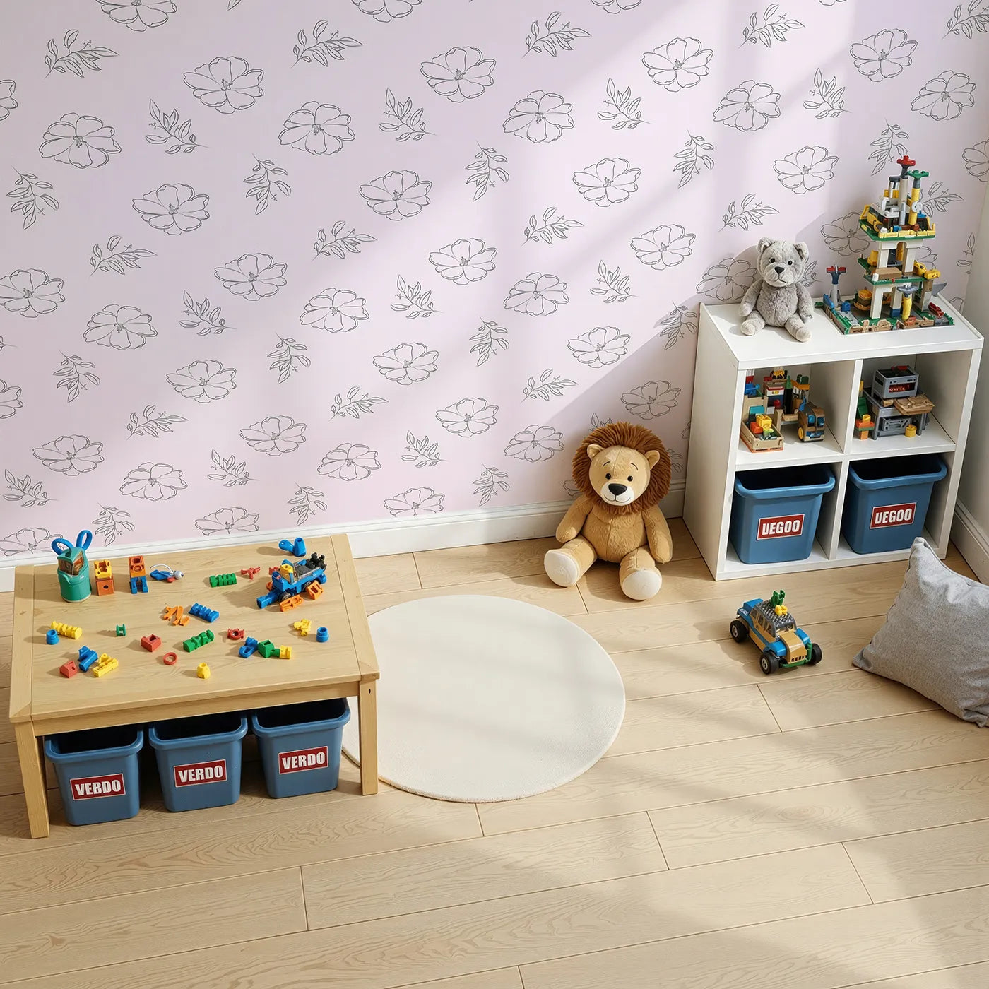 This charming floral wallpaper features a beautiful pattern of delicate, line-art flowers and sprigs. The clean, minimalist design on a blush pink background brings a touch of modern elegance to any room, from a nursery to a big kid's bedroom, without feeling overwhelming.