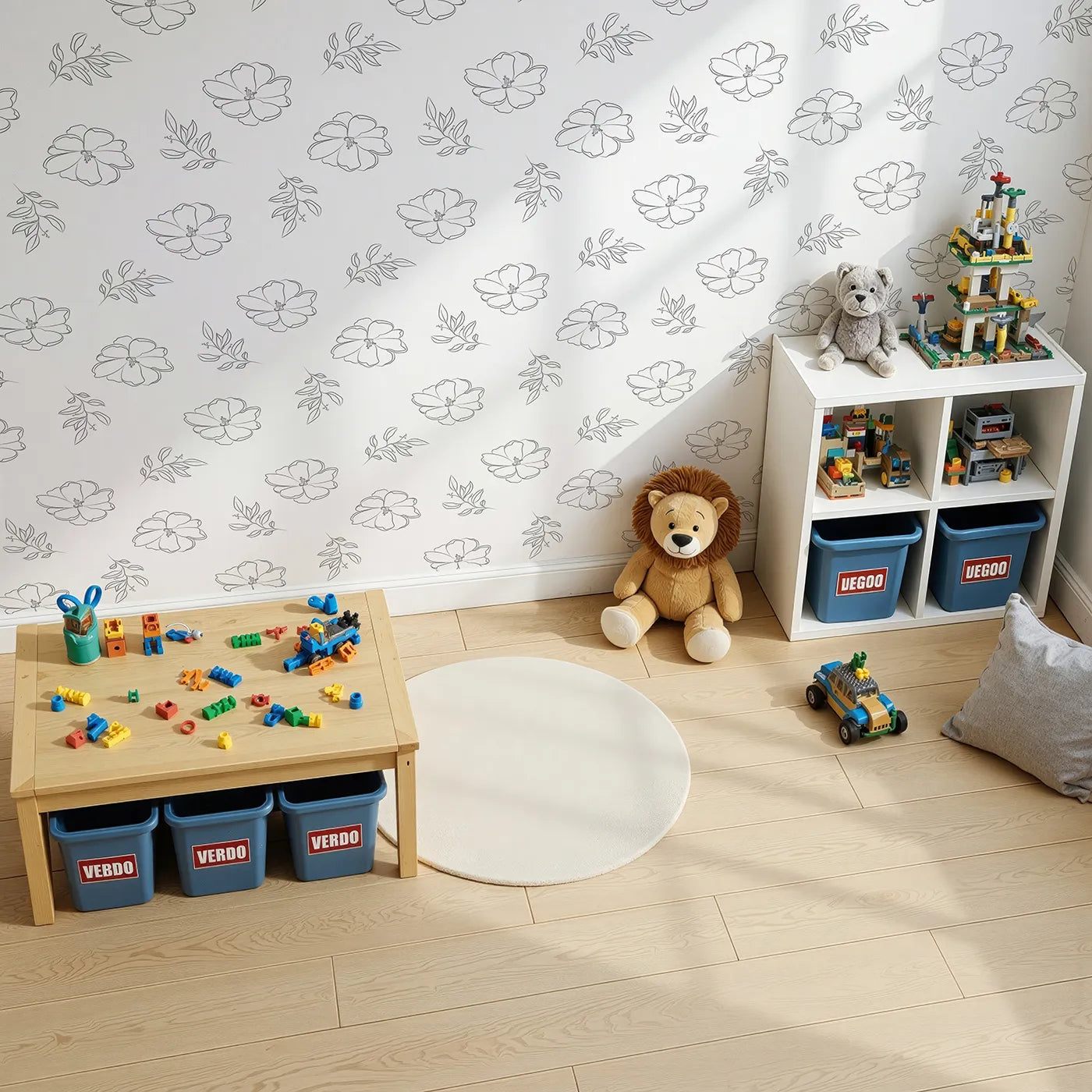 This charming floral wallpaper features a beautiful pattern of delicate, line-art flowers and sprigs. The clean, minimalist design on a crisp white background brings a touch of modern elegance to any room, from a nursery to a big kid's bedroom, without feeling overwhelming.